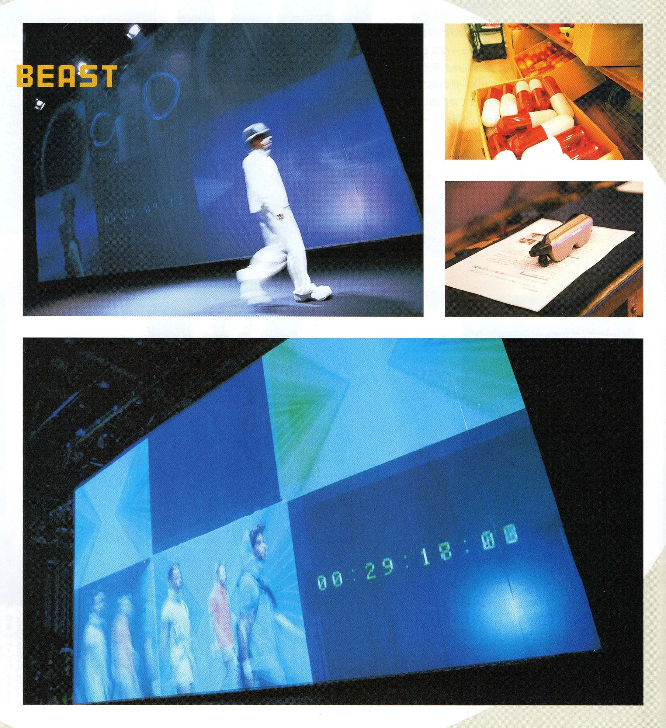 右上 入場時に配られたノベルティのカプセル。右中 ショーの最中にブルールームで使用された"アイトレック"。これをかけることによって、合成された画像を見ることができる。左上 画面の前をウォーキングするモデル。下 イメージルームでの映像。テーマをイメージした映像と、ブルールームを歩くモデルの姿が映し出された。6枚のスクリーンで構成された画面右下には、経過時間が表示されている。
