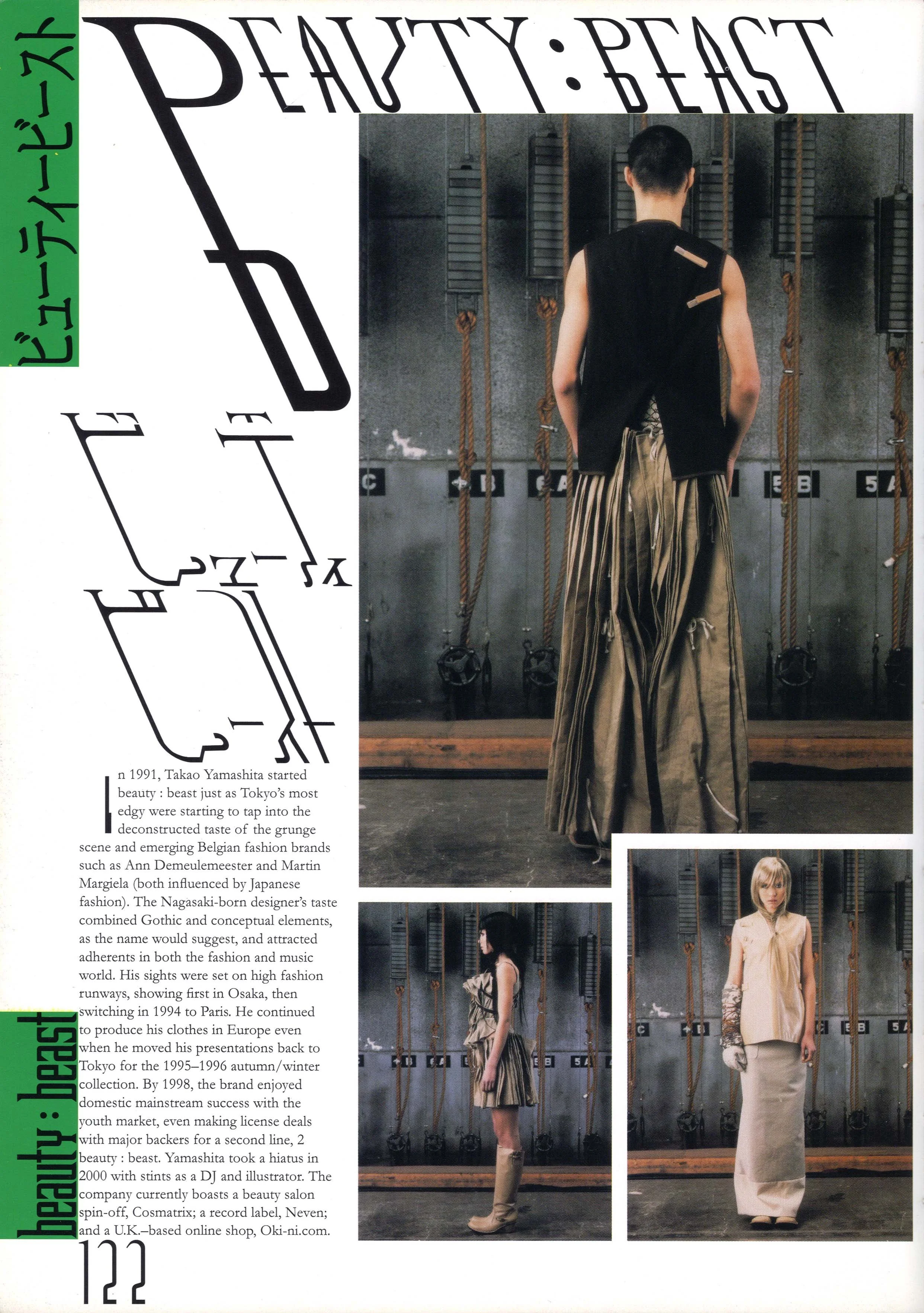 The new wave of Japanese Fashion of the fittest more discerning, setting up a survival-of-the-fittest kind of market. Beauty: Beast designer Takao Yamashita, 33, speaks in unison with his peers when he says that "quality has become a trend. I see the market splitting into two extremes: either really cheap and available clothing, or expensive and high quality fashion. Nothing in between will survive." He continues, "It used to be that a certain brand name was enough to impart a sense of value to an item, but today the customer wants that one extra something with the product."