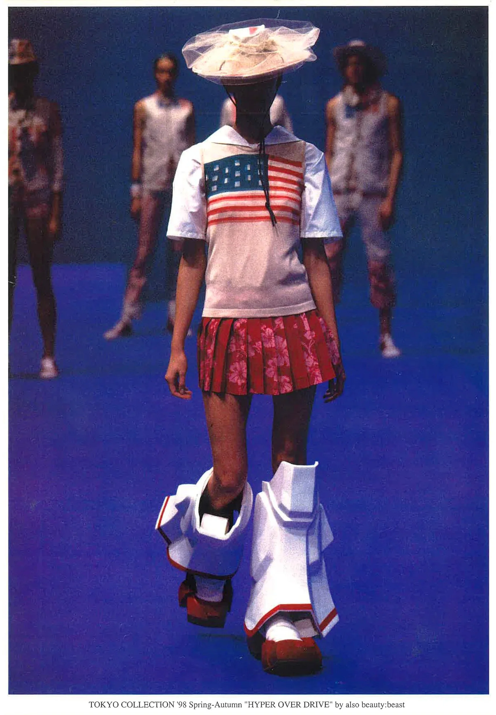 芝公園スタジオで行なわれたビューティ:ビーストのコレクションは、ディテールやシルエットをダイレクトに見せたブルールームとイメージ優先のイメージルームの二部屋で演出された。イメージルームでは、ブルールームで撮影したモデルの映像と、'98-'99秋冬コ レクションのイメージ映像とを合成し、"心の時の超越"というテーマで表現した。デジタル化しつつある日常とともに、コレクションの方法にも変化が訪れたようだ。