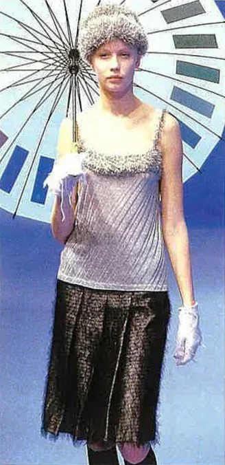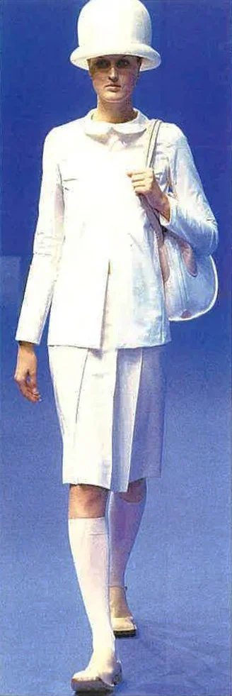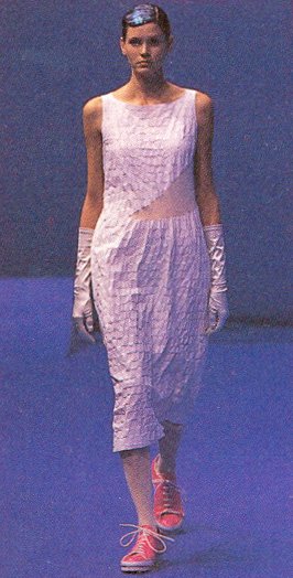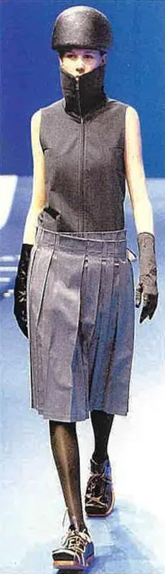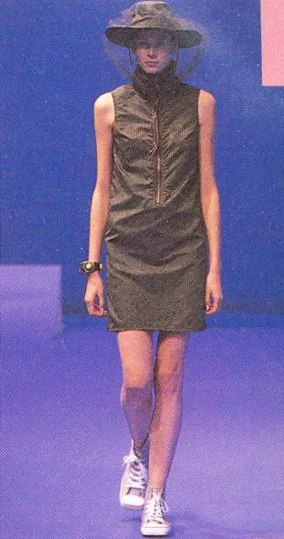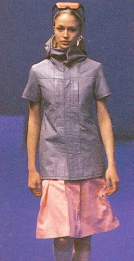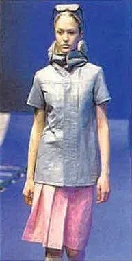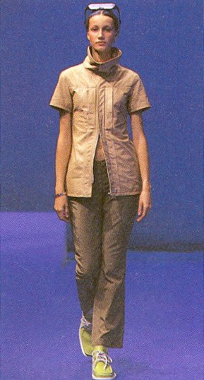 The most recent collection for Spring/Summer 99 is called the "Hyper Drive". It is about going forward into the next millennium. "In this collection the key word was speed. Everything is based on speed, and speed is controlled by time. We are used to thinking of a lifetime as going from A to B, B to C, but actually on the spiritual side it is more like a spiral direction to going forward, because sometimes you back up to previous ideas.