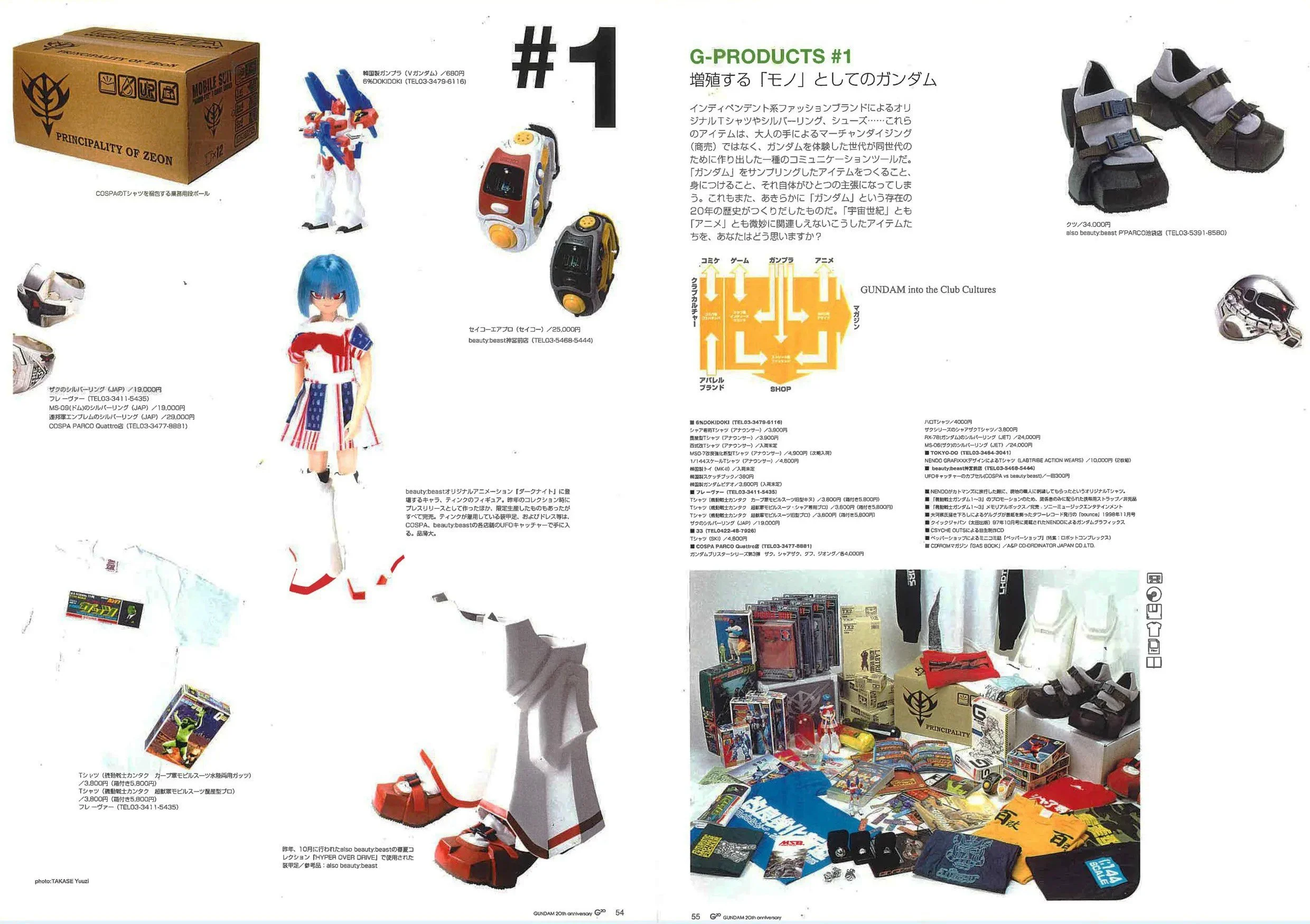 インディペンデント系ファッションブランドによるオリジナルTシャツやシルバーリング、シューズ⋯⋯これらのアイテムは、大人の手によるマーチャンダイジング(商売)ではなく、ガンダムを体験した世代が同世代のために作り出した一種のコミュニケーションツールだ。「ガンダム」をサンプリングしたアイテムをつくること、身につけること、それ自体がひとつの主張になってしまう。これもまた、あきらかに「ガンダム」という存在の20年の歴史がつくりだしたものだ。「宇宙世紀」とも「アニメ」とも微妙に関連しえないこうしたアイテムたちを、あなたはどう思いますか?