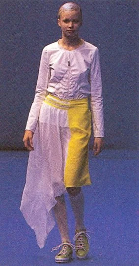 Yamashita says his work is about inner growth, and about Looking at and marrying the forces of good and evil that coexist in humans. For A/W '00, Yamashita plans to use yellow, and the sunflower as a working theme. "I see society as a field of sunflowers. Yet we usually see the tall, narrow upturned face of the sunflower in photographs as a single flower. It's somehow symbolic of the fact that there really are no basic trends anymore, but there is the individual," he says.