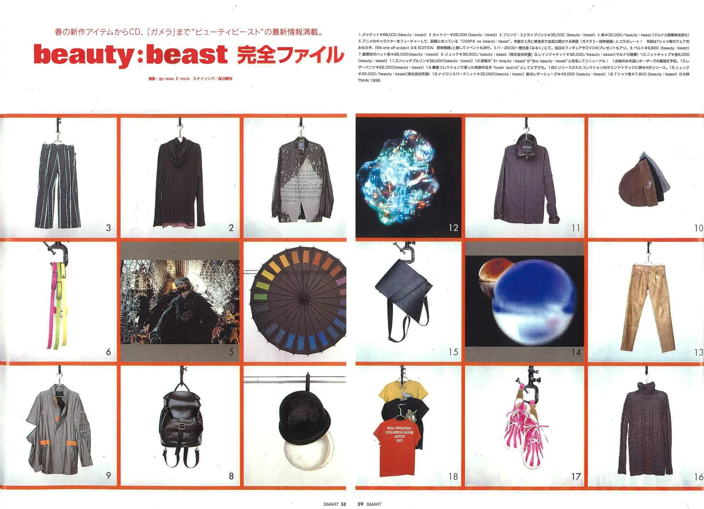 1.ジャケット¥68,000(beauty:beast)2.カットソー¥26,000(beauty:beast)3.フリンジ・ストライプパンツ¥35,000(beauty:beast)4.傘¥30,000/beauty:beast(マルナカ商事株式会社)5.アニメのキャラクターをフィーチャーして、話題となっている〝COSPA vs beauty:beast〞。今度は3月に東宝系で全国公開される映画「ガメラ3~邪神覚醒」とコラボレート!今回はTシャツ等のウェアのみならず、「life one off project GⅢ EDITION 邪神覚醒」と題してイベントも決行。3/1・20:00~恵比寿「みるく」にて。当日はフィギュアやDVDのプレゼントもアリ。6.ベルト¥9,800(beauty:beast)7.~素材のハット各¥28,000(beauty:beast)8.リュック¥39,000/beauty:beast(株式会社研鑽)9.レインジャケット¥32,000/beauty:beast(マルナカ商事)10.ニットキャップ¥各6,000(beauty:beast)11.ストレッチブルゾン¥38,000(beauty:beast)12.原宿の〝9r beauty:beast〞が〝9re beauty:beast〞と改名してリニューアル! 1点物のみを扱いオーダーでの展開を予定。13.レザーパンツ¥62,000(beauty:beast)14.春夏コレクションで使った映像作品を〝hyper quartz〞としてビデオ化。1月にリリースされたコレクションのサウンドトラックに続き4月リリース。15.リュック¥22,000/beauty:beast(株式会社枡園)16.ナイロンスパークニット¥32,000(beauty:beast)蛍光レザーシューズ¥45,000(beauty:beast)18.Tシャツ各¥7,800(beauty:beast)©大映 TNHN 1999