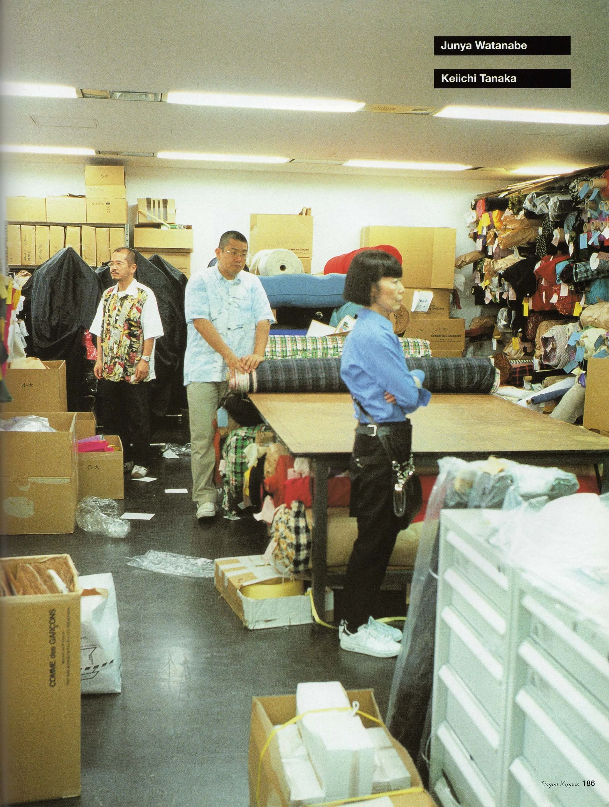 In addition to his own collection, Junya Watanabe (center) designs for tricot COMME des GARÇONS, while Keiichi Tanaka (left) works for COMME des GARÇONS HOMME. Both are allowed to operate independently within the company, which is somewhat rare in the fashion industry. They work on the same vibrant floor of the company's headquarters in Minami-Aoyama. Regarding Kawakubo, who not only employs them but also encourages and inspires them, they had this to say: