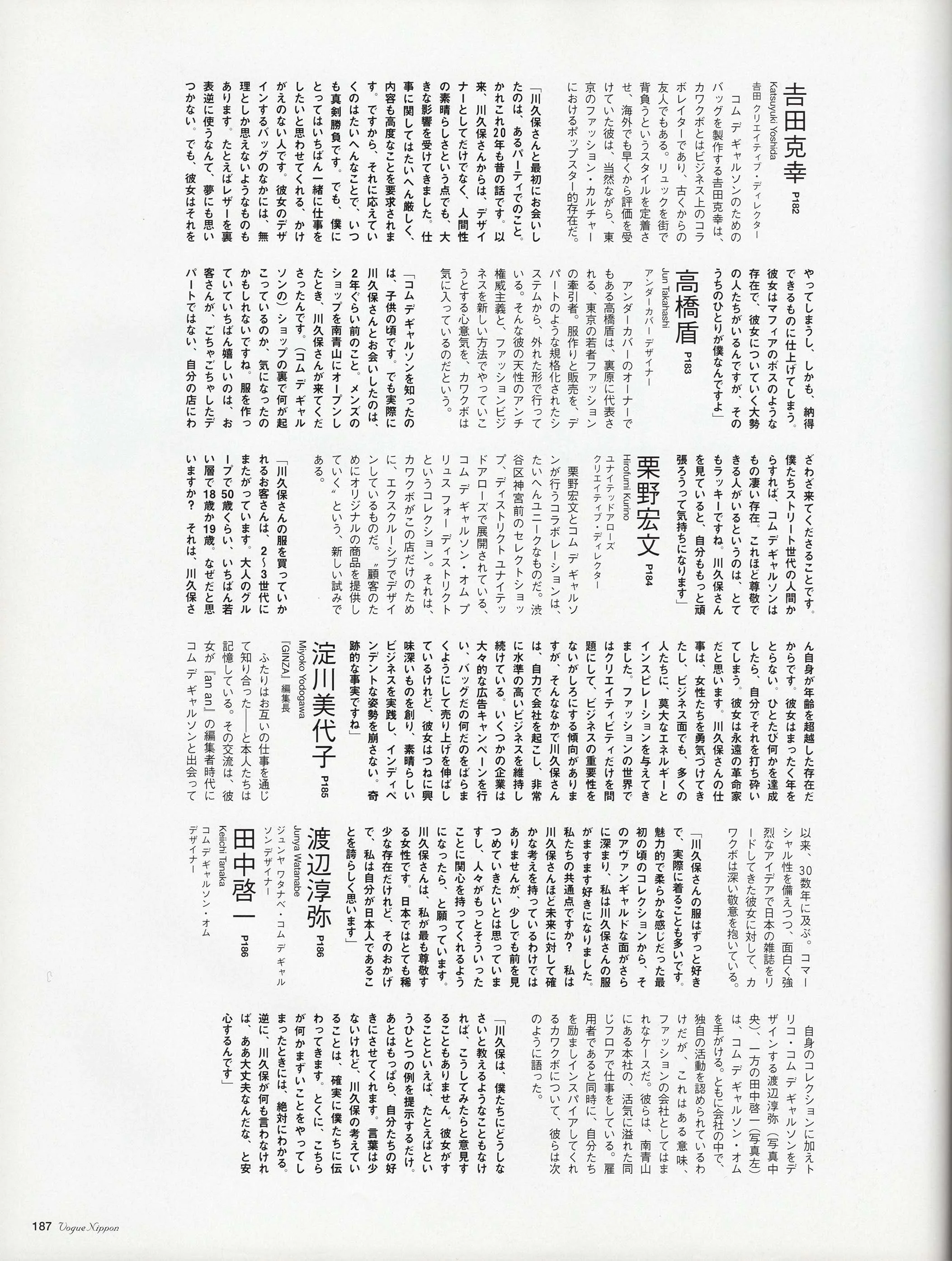 ふたりはお互いの仕事を通じて知り合った――と本人たちは記憶している。その交流は、彼女が『an an』の編集者時代にコム デ ギャルソンと出会って以来、30数年に及ぶ。コマーシャル性を備えつつ、面白く強烈なアイデアで日本の雑誌をリードしてきた彼女に対して、カワクボは深い敬意を抱いている。