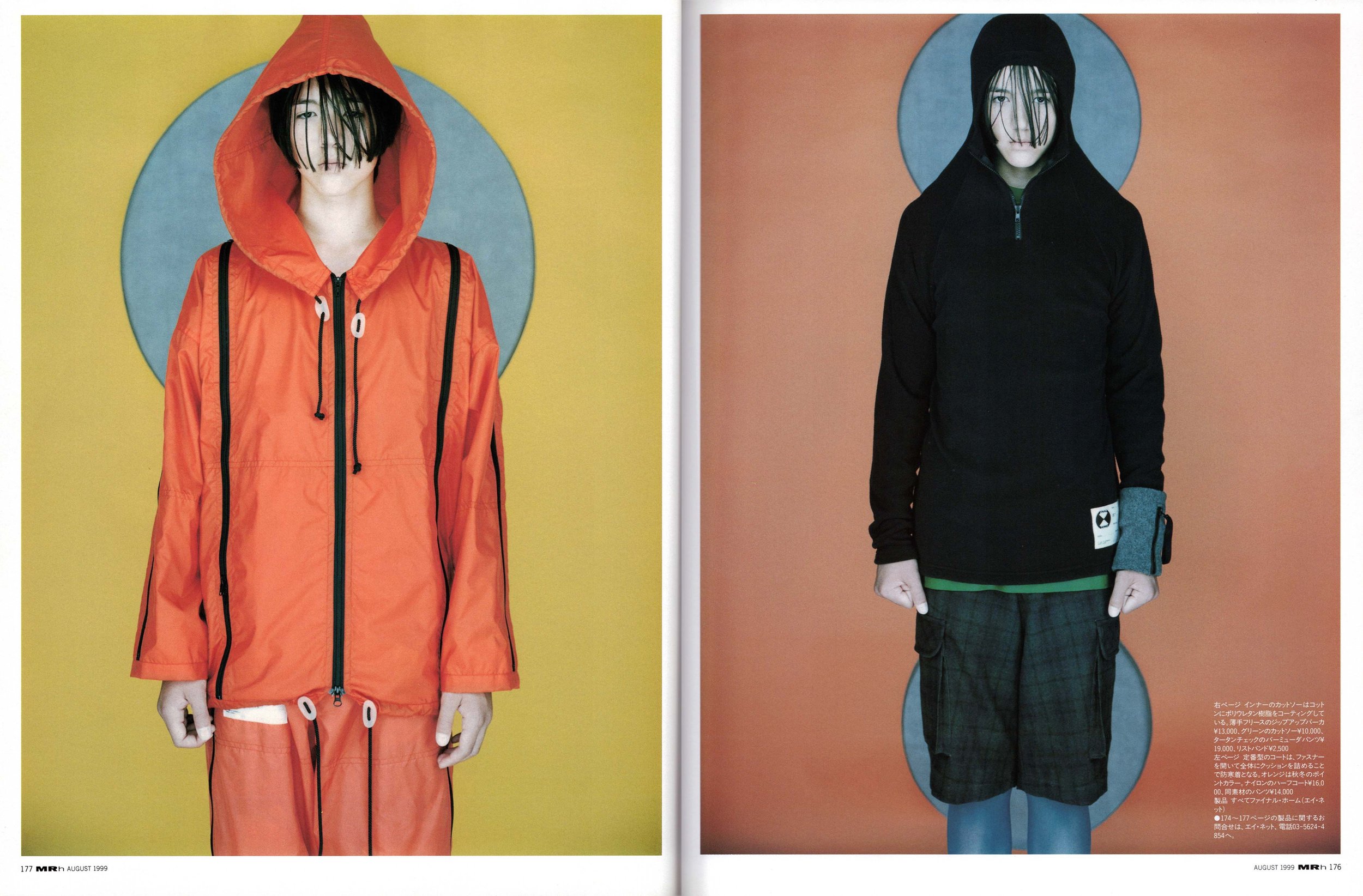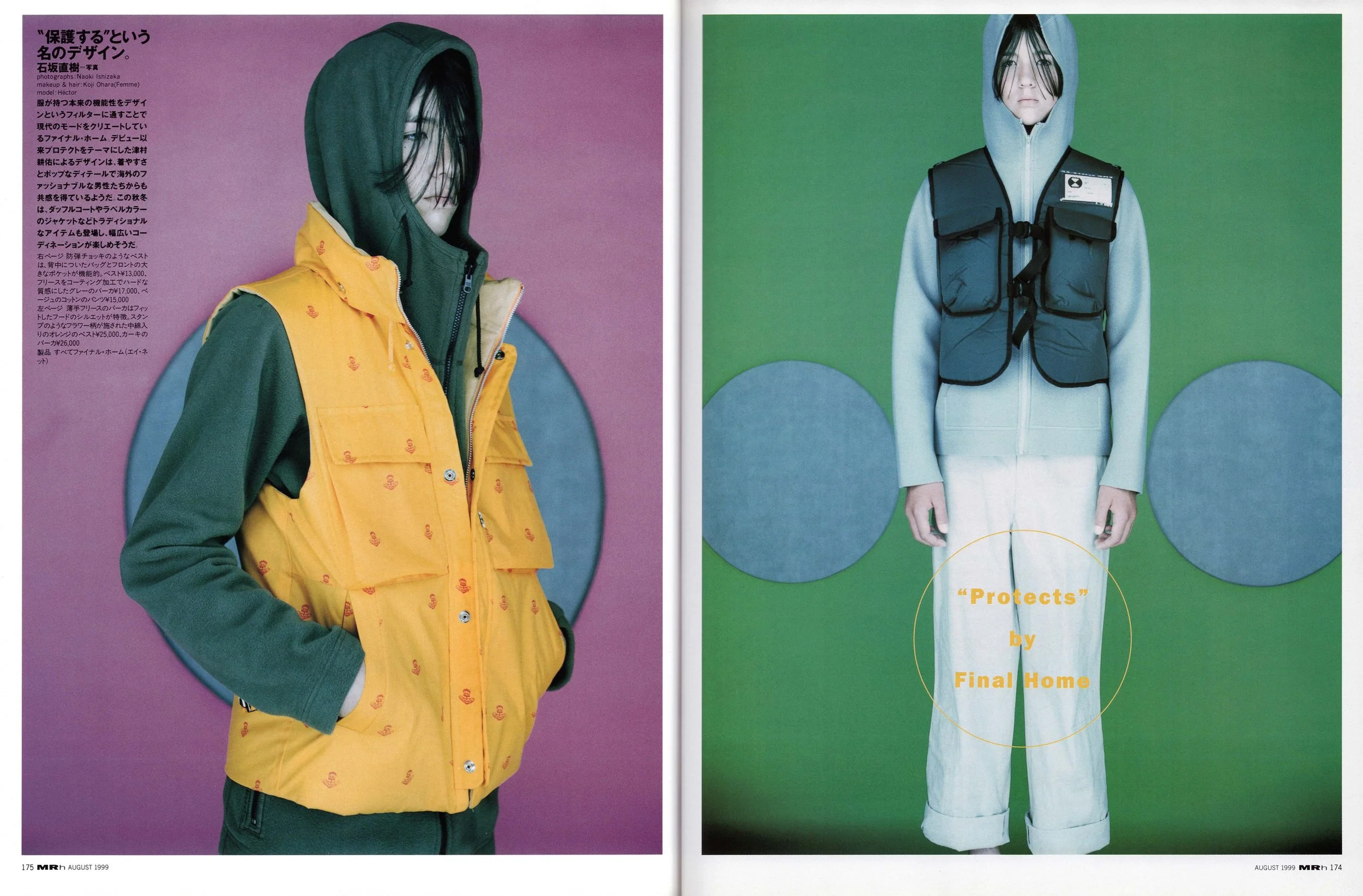 「自然の中に家がぽつんと立っている場面はオブジェとして際立って見えるけれど、もう幻想でしかない。集合住宅に住む人間にとって、家とは部屋という単なる内部空間。そうすると僕には、家を出てからのアーケードも地下鉄も仕事場もどこかの店も同じ空間のつながりという気がする。違いは家具や飾りだけ。だからみんな自分の好きなもので部屋を一杯にするんだね。どういじって気分よくするか」。中と外の差がなくなってきているという、彼の直感は正しい。二〇世紀後半に入ってから、家の役割は減少し続けているのだから。大家族を抱え、大きな家を建てるのが成功のあかしだった時代に比べ、同居が減り、子どもの出生率は下がり、家族の人数は極端に少なくなってしまった。ファストフードのおかげで、家で煮炊きをしなくても食べていける。最終的に家の機能を集約すると、雨露から保護することと収納に行き着く。それをさらに簡素化させ凝縮させたものが、ファイナル・ホーム・ジャケットだ。「作った当時は世紀末的なデカダンな気持ちもあったけれど、ブランドとして立ち上げるに当たっては、ポジティブでニュートラルな精神で行こうと。本来服の持つ、雨、寒さ、日光から守るというハードな部分だけでなく、安心感、解放感といったメンタルな面もフォローして、素材、色、柄、機能も考えていく」。その上で彼は、着る人に仕上げをゆだねている。部屋を飾るように、ポケットに何を入れてもいい。パーツをどうアレンジしてもいい。自分の服を作って、と投げかける。