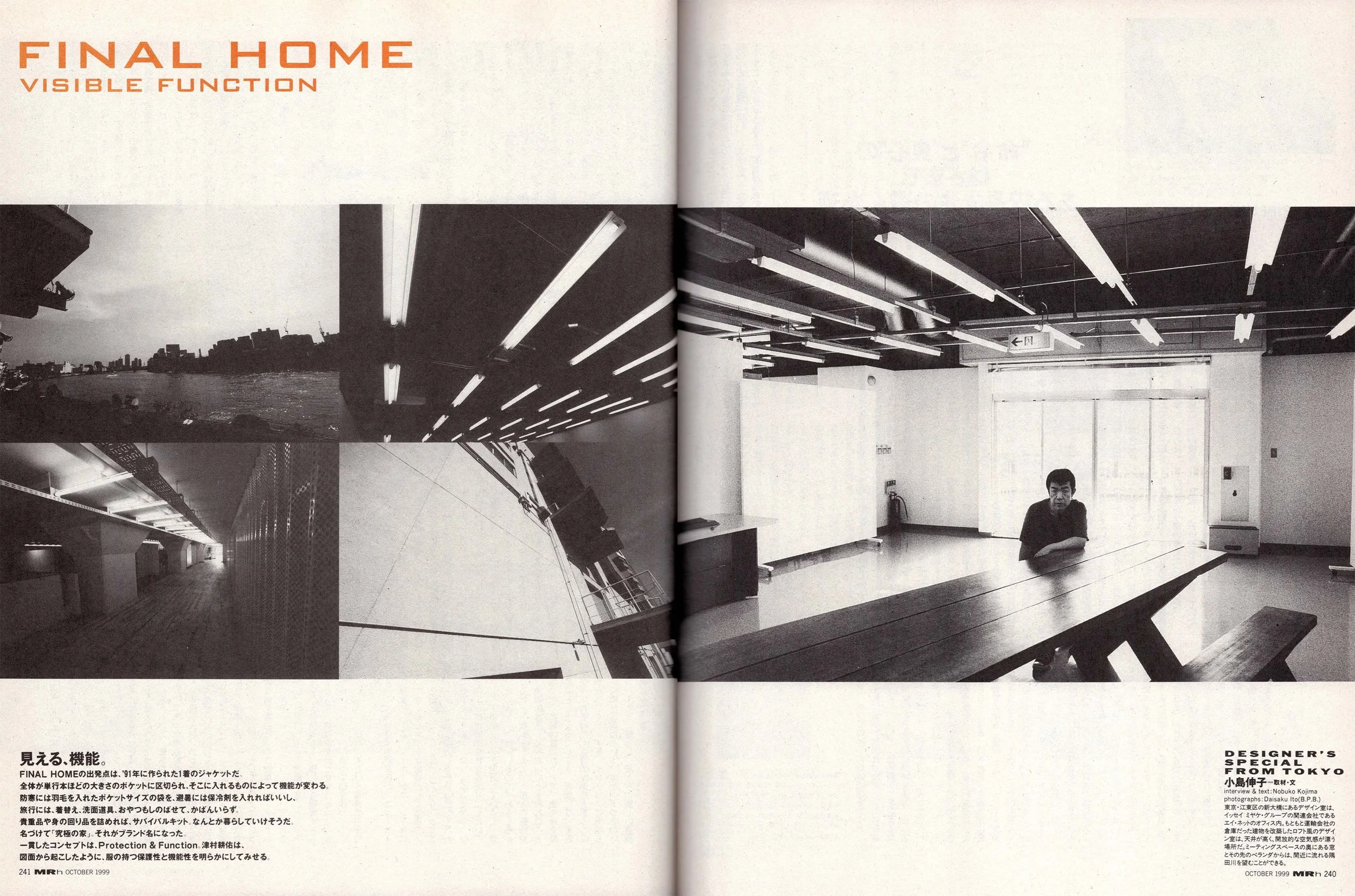 九月には海外最初の路面店が、ニューヨークにオープンする。ソーホーがブランド街になった今、最もホットな地域として注目のノリータ地区。「アメリカは、コミック、ポップアートなど、大衆文化が生まれた国だから、わかりやすさが必要。エスニックではなくて、ソニーのように技術的な性能を売りにしたい。アウトドアのカタログが発達しているし、発明好きの人がいっぱいいるので、おもしろがってくれそうな気もします。外国人の建築家に、僕の服はきものみたいだと言われたことがあった。和服は直線カットで、懐や袖や帯にものをしまえるでしょう。機能には、言葉やジャンルを越えた説得力があると思う」。これからはアイディアを、インテリアに応用していくのが課題だという。ポケットつきのいすカバーとか、壁とか。服と家の新しい展開が楽しみだ。