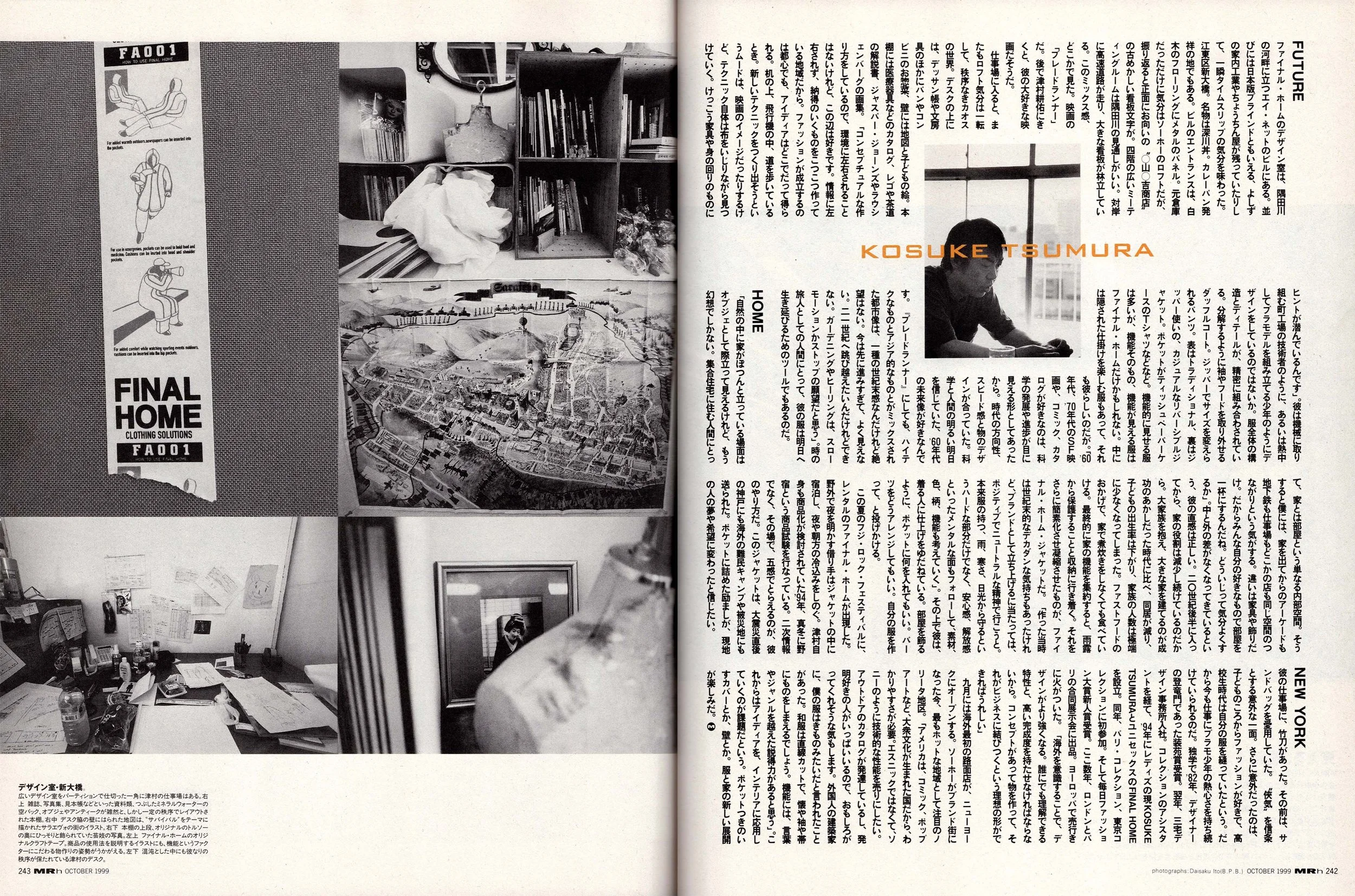仕事場に入ると、またもロフト気分は一転して、秩序なきカオスの世界。デスクの上には、デッサン帳や文房具のほかにバンやコンビニのお惣菜、壁には地図と子どもの絵。本棚には医療器具などのカタログ、レゴや茶道の解説書、ジャスパー・ジョーンズやラウシェンバーグの画集。「コンセプチュアルな作り方をしているので、環境に左右されることはないけれど、この辺は好きです。情報に左右されず、納得のいくものをこつこつ作っている地域だから。ファッションが成立するのは都心でも、アイディアはどこでだって得られる。机の上、飛行機の中、道を歩いているとき。新しいテクニックをつくり出そうというムードは、映画のイメージだったりするけど、テクニック自体は布をいじりながら見つけていく。けっこう家具や身の回りのものにヒントが潜んでいるんです」。彼は機械に取り組む町工場の技術者のように、あるいは熱中してプラモデルを組み立てる少年のようにデザインをしているのではないか。服全体の構造とディテールが、精密に組み合わされている。分解するように袖やフードを取り外せるダッフルコート。ジッパーでサイズを変えられるパンツ。表はトラディショナル、裏はジッパー使いの、カジュアルなリバーシブルジャケット。ポケットがティッシュペーパーケースのTシャツなどなど。機能的に見せる服は多いが、機能そのもの、機能が見える服はファイナル・ホームだけかもしれない。中には隠された仕掛けを楽しむ服もあって、それも彼らしいのだが。「’60年代、’70年代のSF映画や、コミック、カタログが好きなのは、科学の発展や進歩が目に見える形としてあったから。時代の方向性、スピード感と物のデザインが合っていた。科学と人間の明るい明日を信じていた、’60年代の未来像が好きなんです。『ブレードランナー』にしても、ハイテクなものとアジア的なものとがミックスされた都市像は、一種の世紀末感なんだけれど絶望はない。今は先に進みすぎて、よく見えない。二一世紀へ跳び越えたいんだけれどできない。ガーデニングやヒーリングは、スローモーションかストップの願望だと思う」。時の旅人としての人間にとって、彼の服は明日へ生き延びるためのツールでもあるのだ。