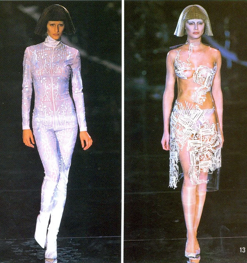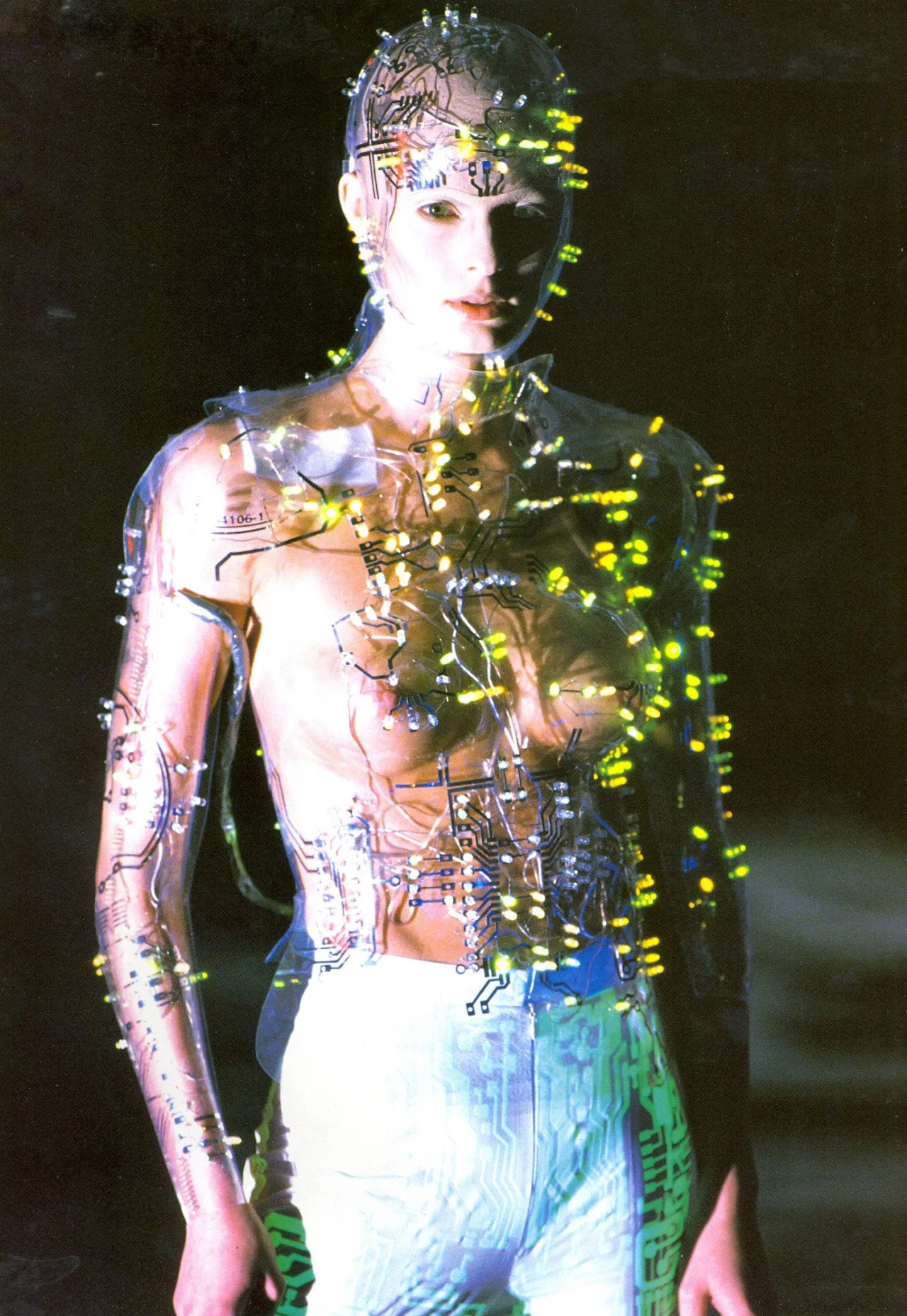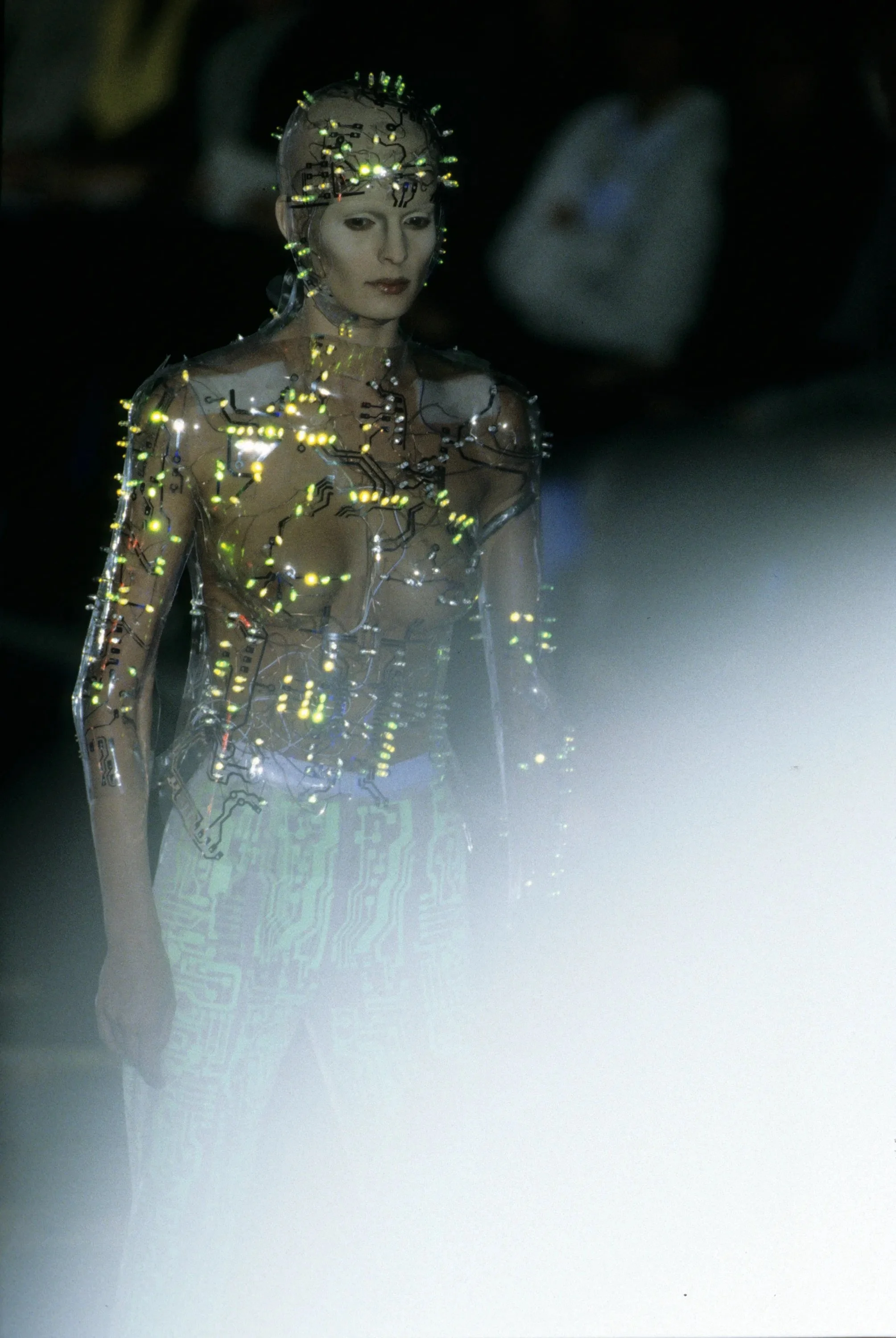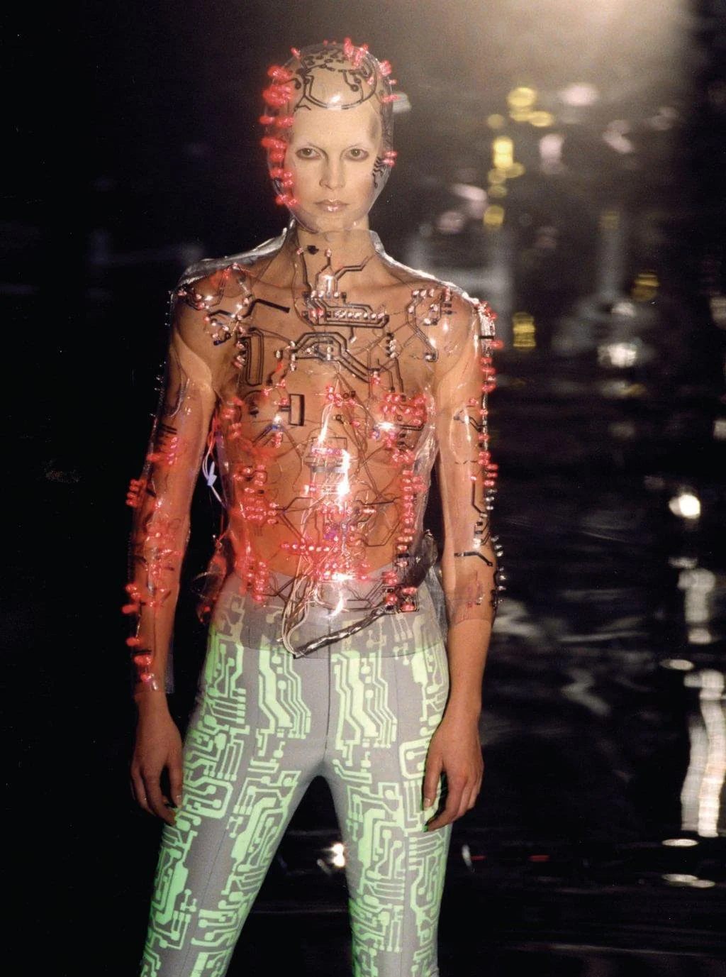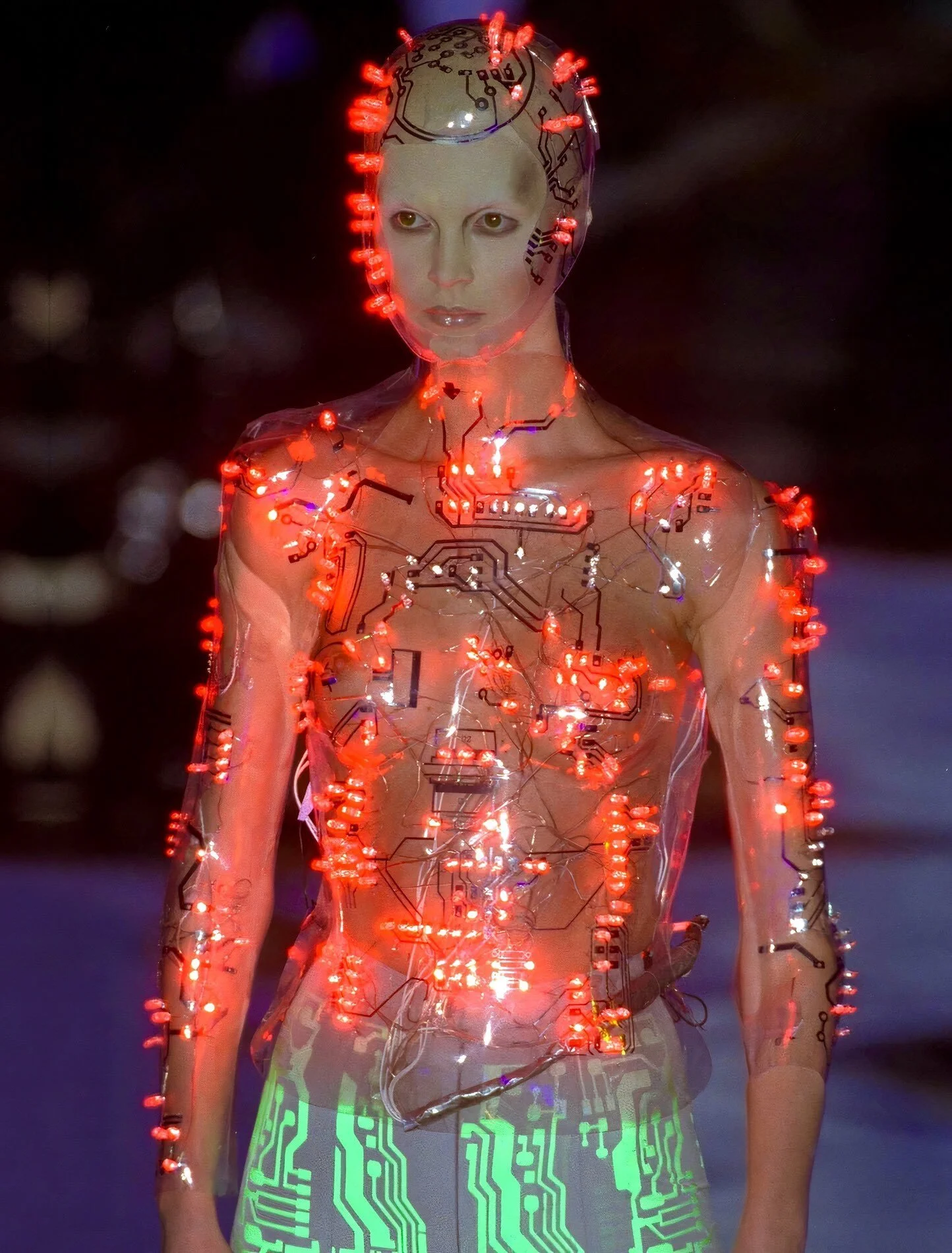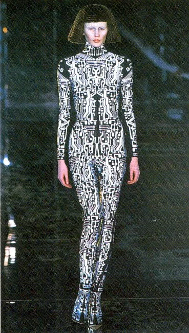 McQueen opened his collection with a laser show, and sent Tron-inspired models in what one observer described as “android couture” down a silvery mirrored runway. Embellishments, embroidered and printed, took the form of circuit boards. Glow-in-the-dark looks added drama to the show, as did the light-up finale pieces. These were made of molded clear plastic “vac-formed from plaster body casts” and fitted out with battery-powered, “programmed flashing LEDs.” The only thing missing in this bright picture of the future was shades.