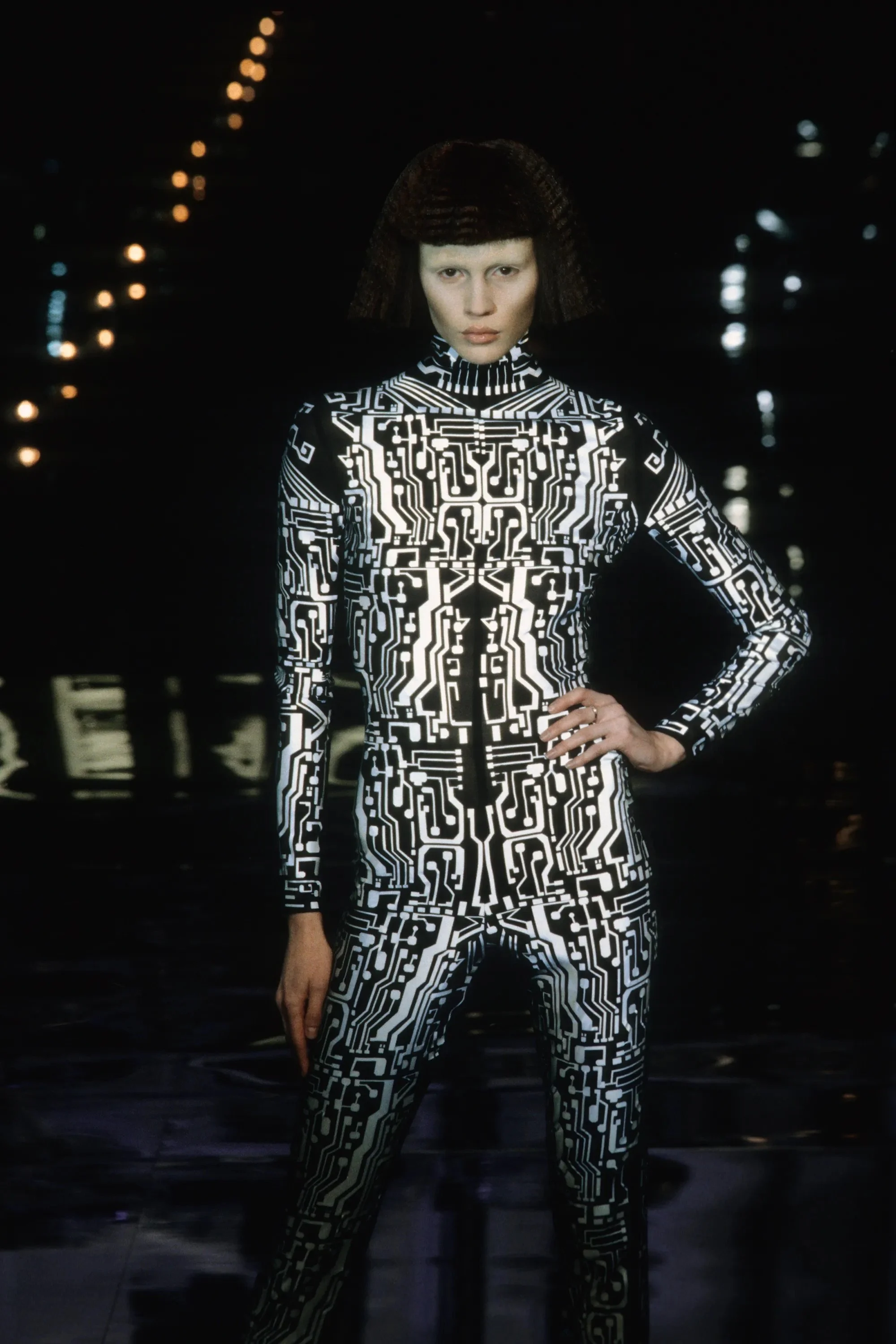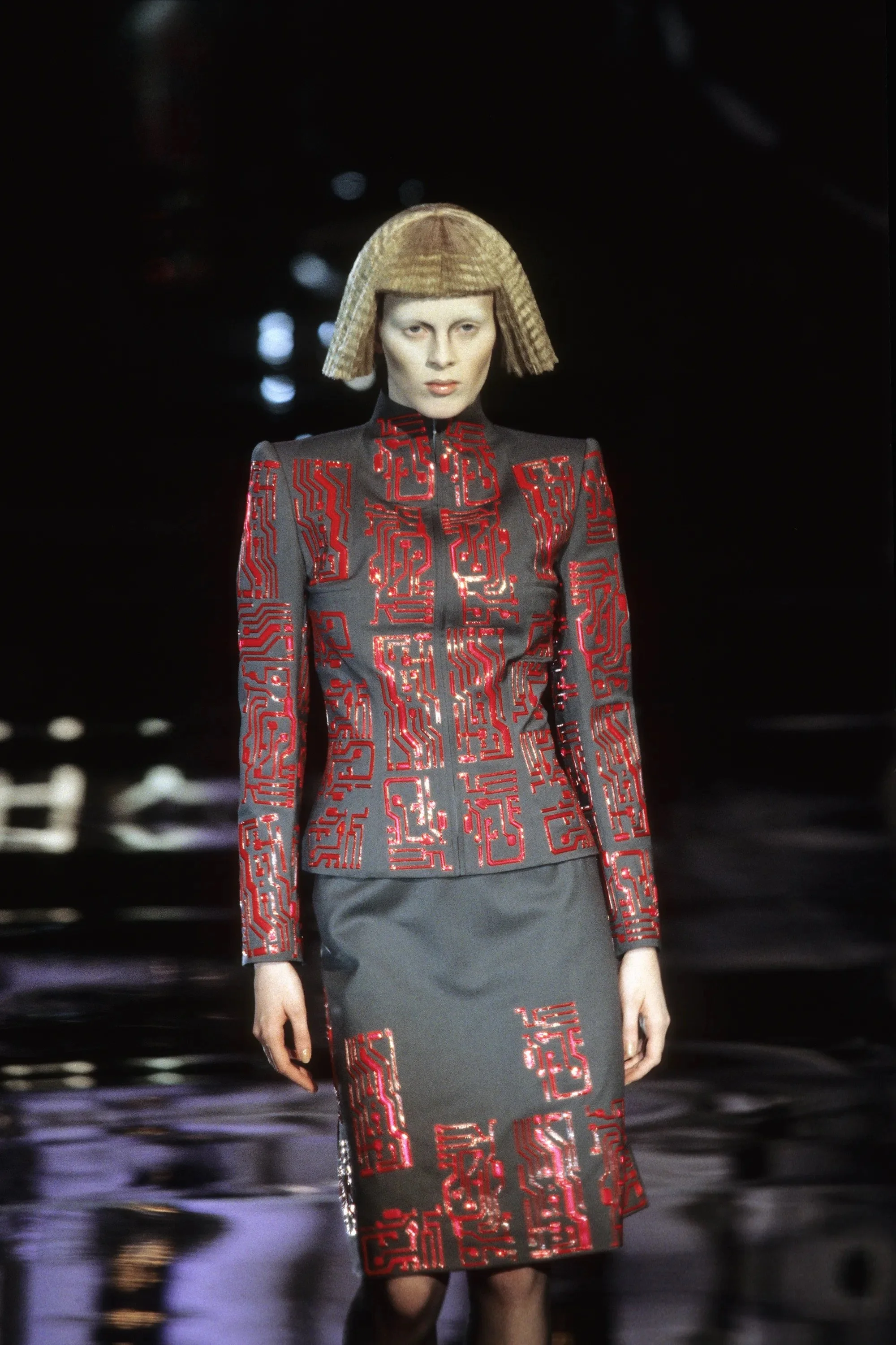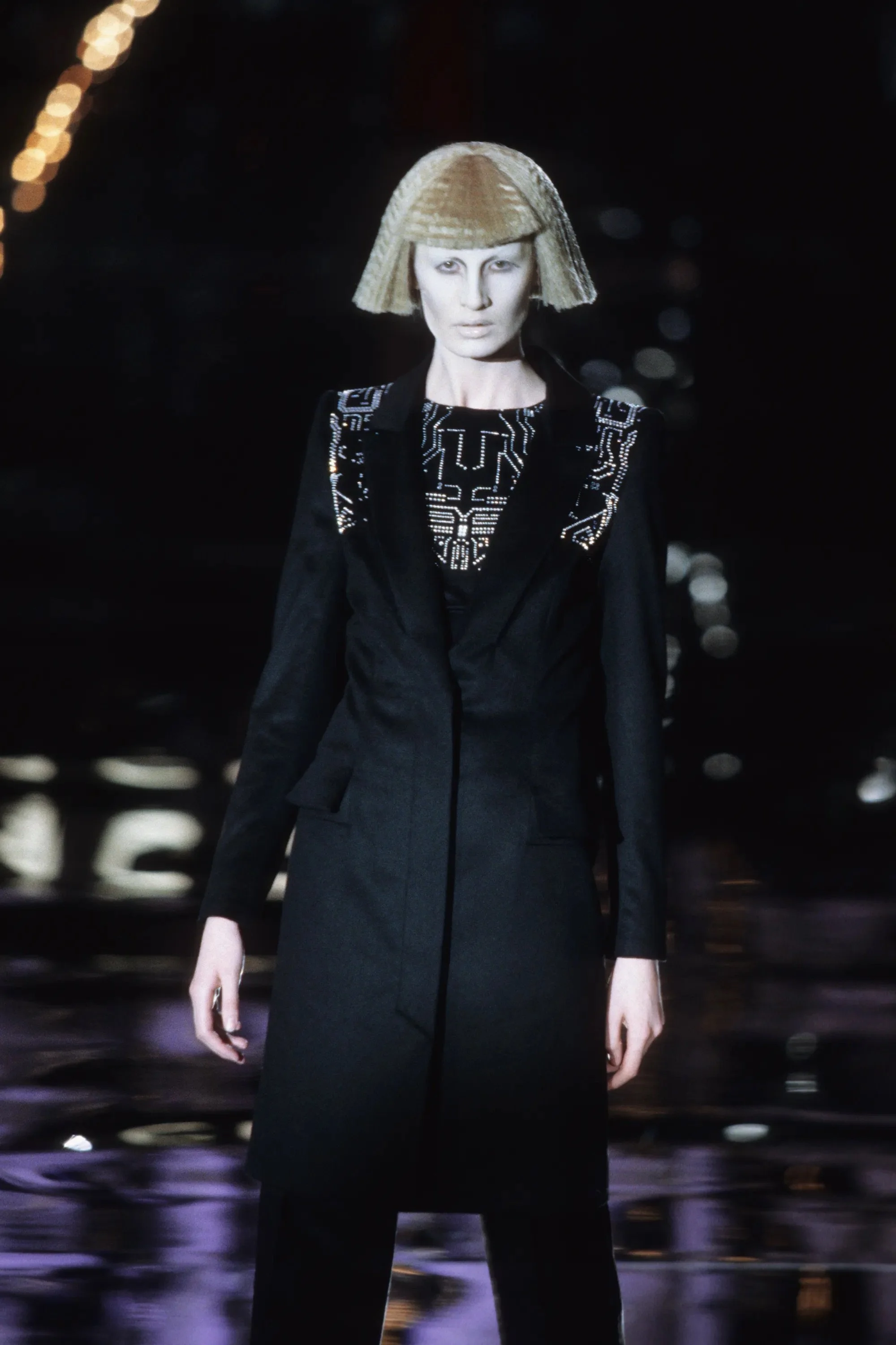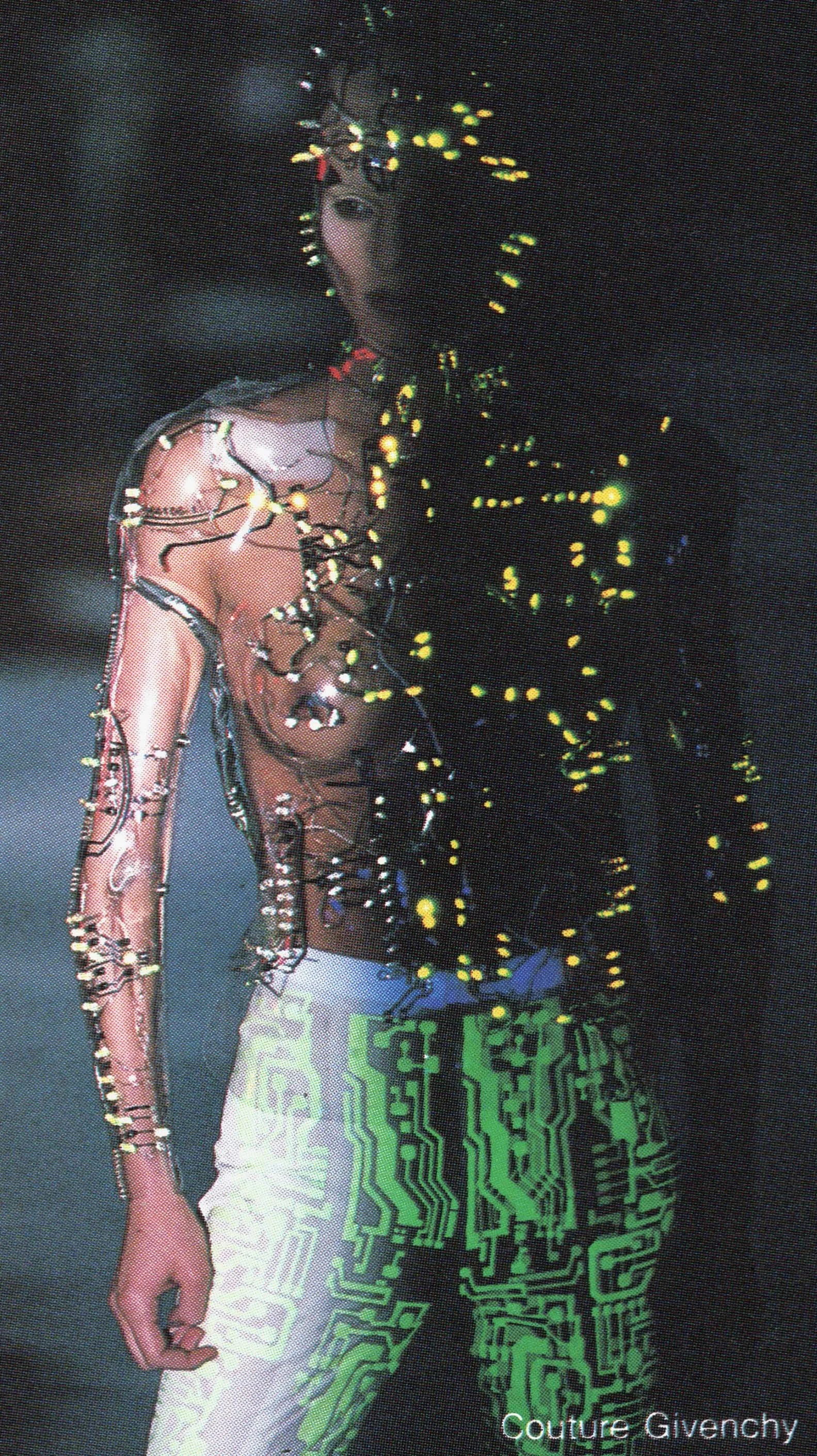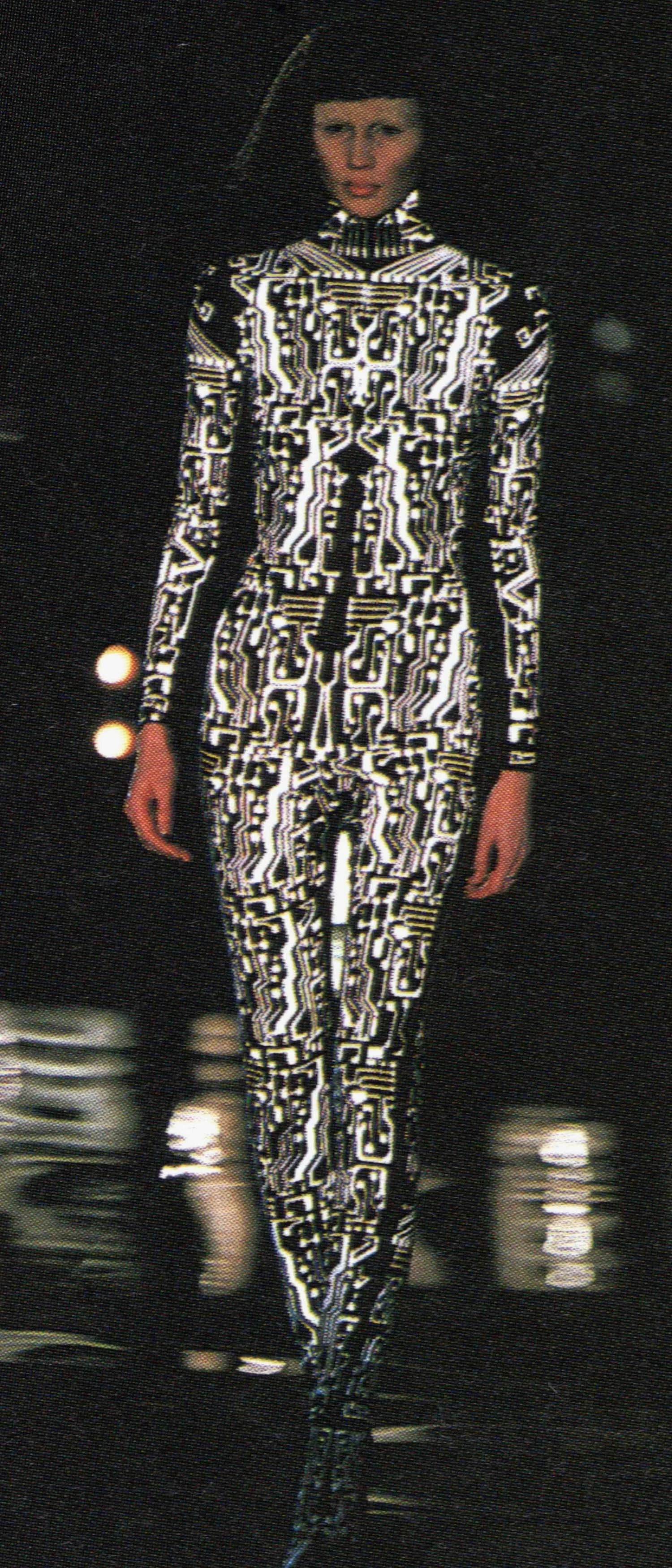 McQueen opened his collection with a laser show, and sent Tron-inspired models in what one observer described as “android couture” down a silvery mirrored runway. Embellishments, embroidered and printed, took the form of circuit boards. Glow-in-the-dark looks added drama to the show, as did the light-up finale pieces. These were made of molded clear plastic “vac-formed from plaster body casts” and fitted out with battery-powered, “programmed flashing LEDs.” The only thing missing in this bright picture of the future was shades.