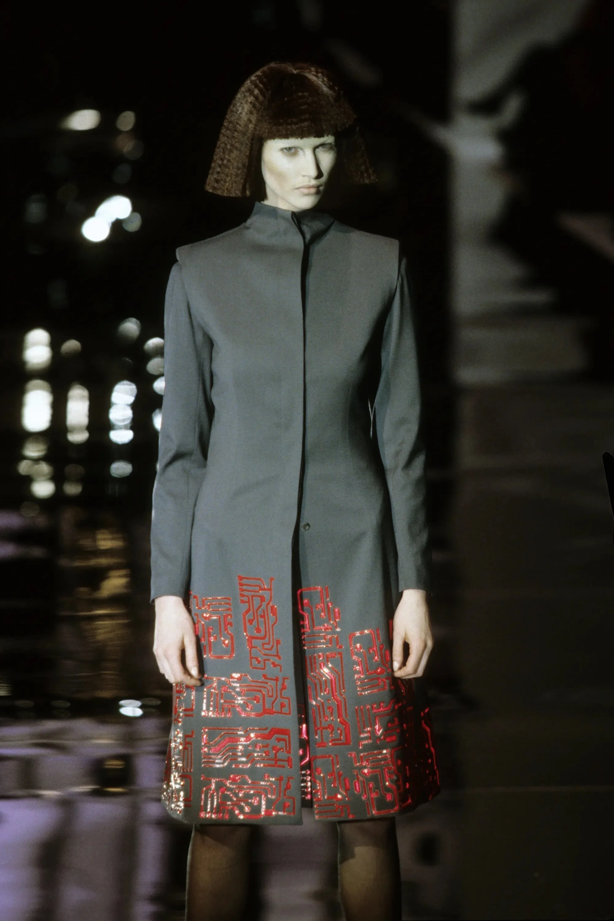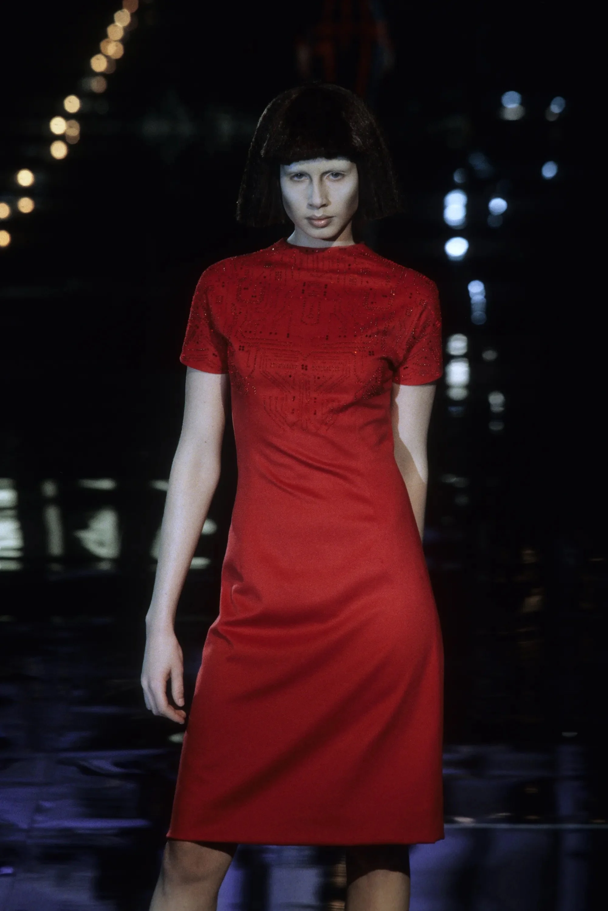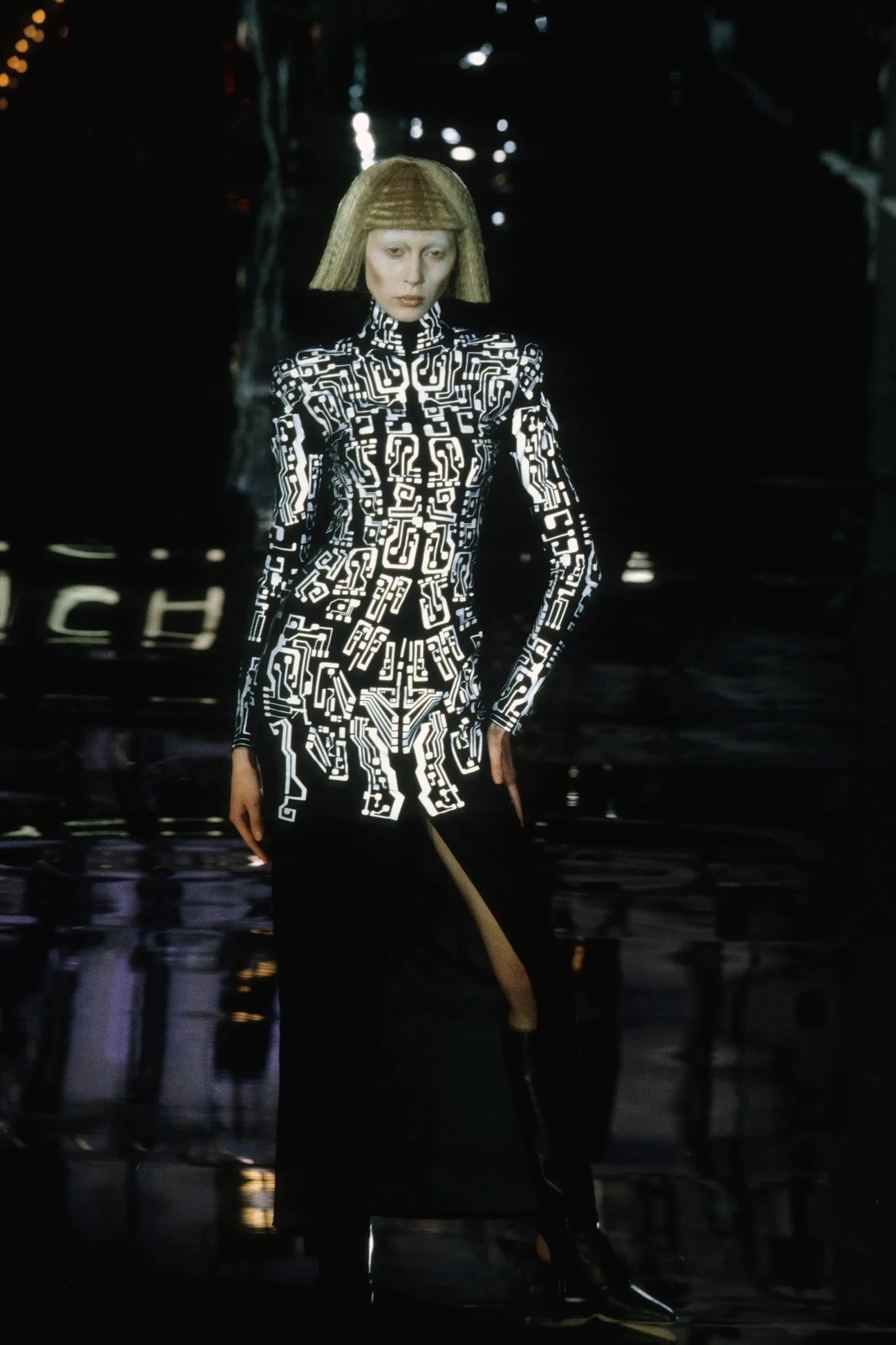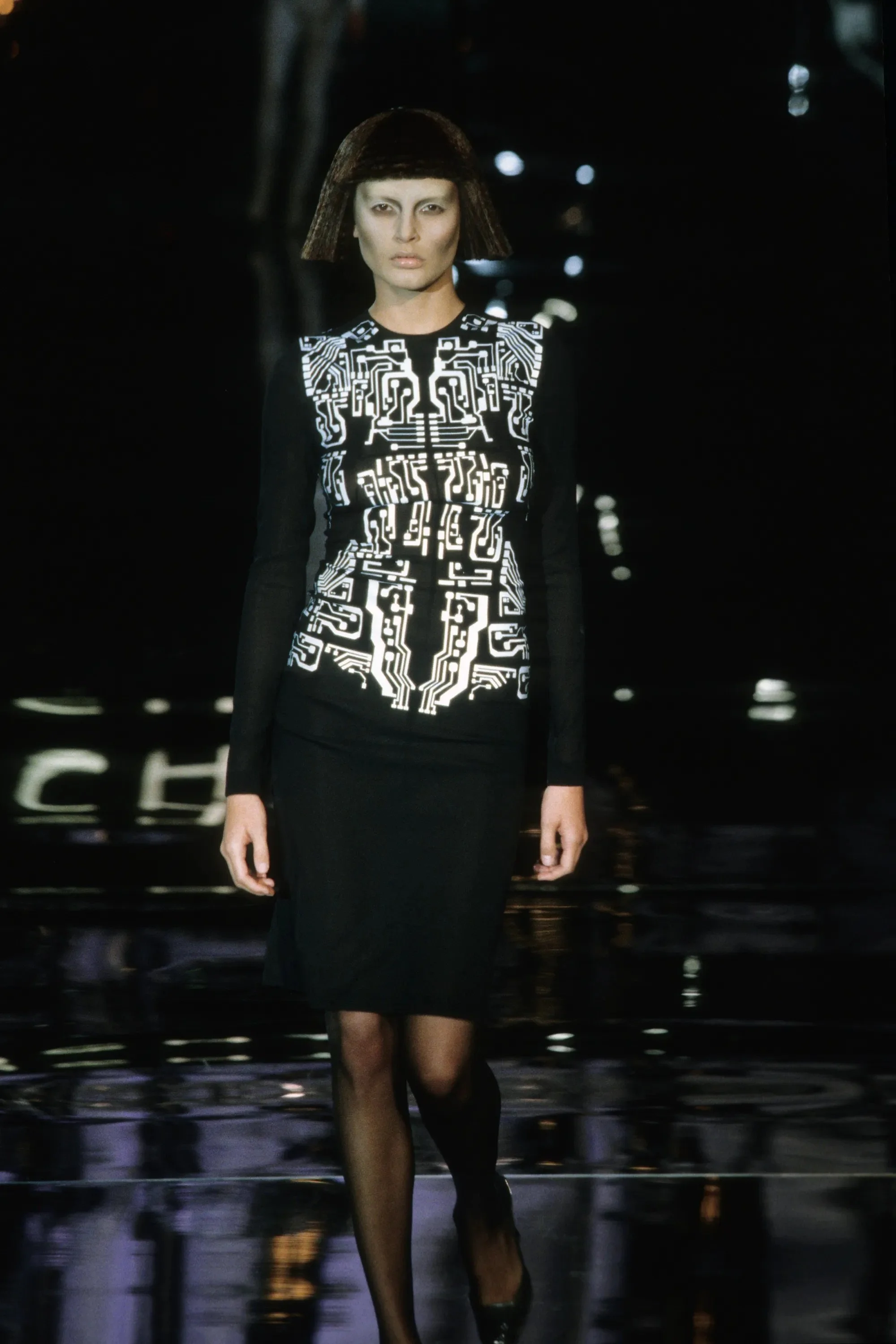 McQueen opened his collection with a laser show, and sent Tron-inspired models in what one observer described as “android couture” down a silvery mirrored runway. Embellishments, embroidered and printed, took the form of circuit boards. Glow-in-the-dark looks added drama to the show, as did the light-up finale pieces. These were made of molded clear plastic “vac-formed from plaster body casts” and fitted out with battery-powered, “programmed flashing LEDs.” The only thing missing in this bright picture of the future was shades.