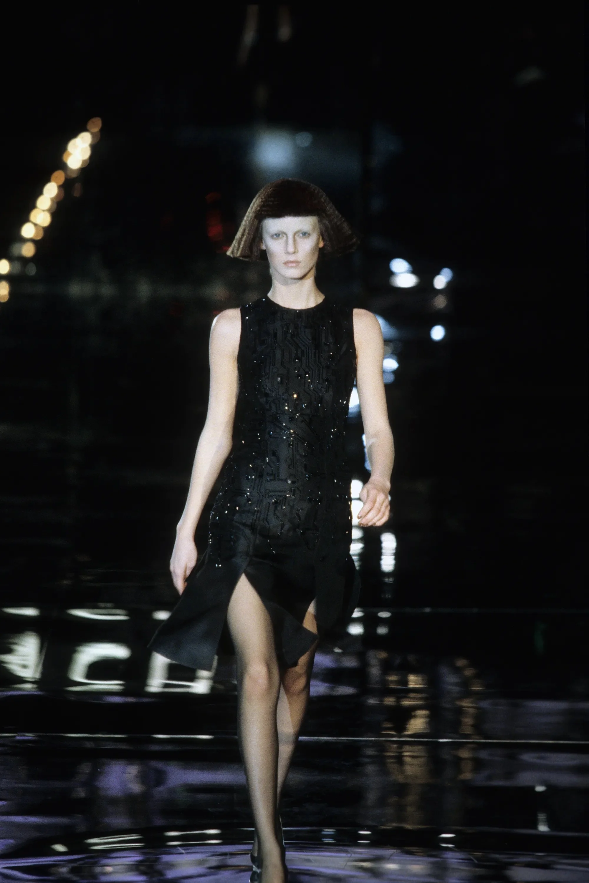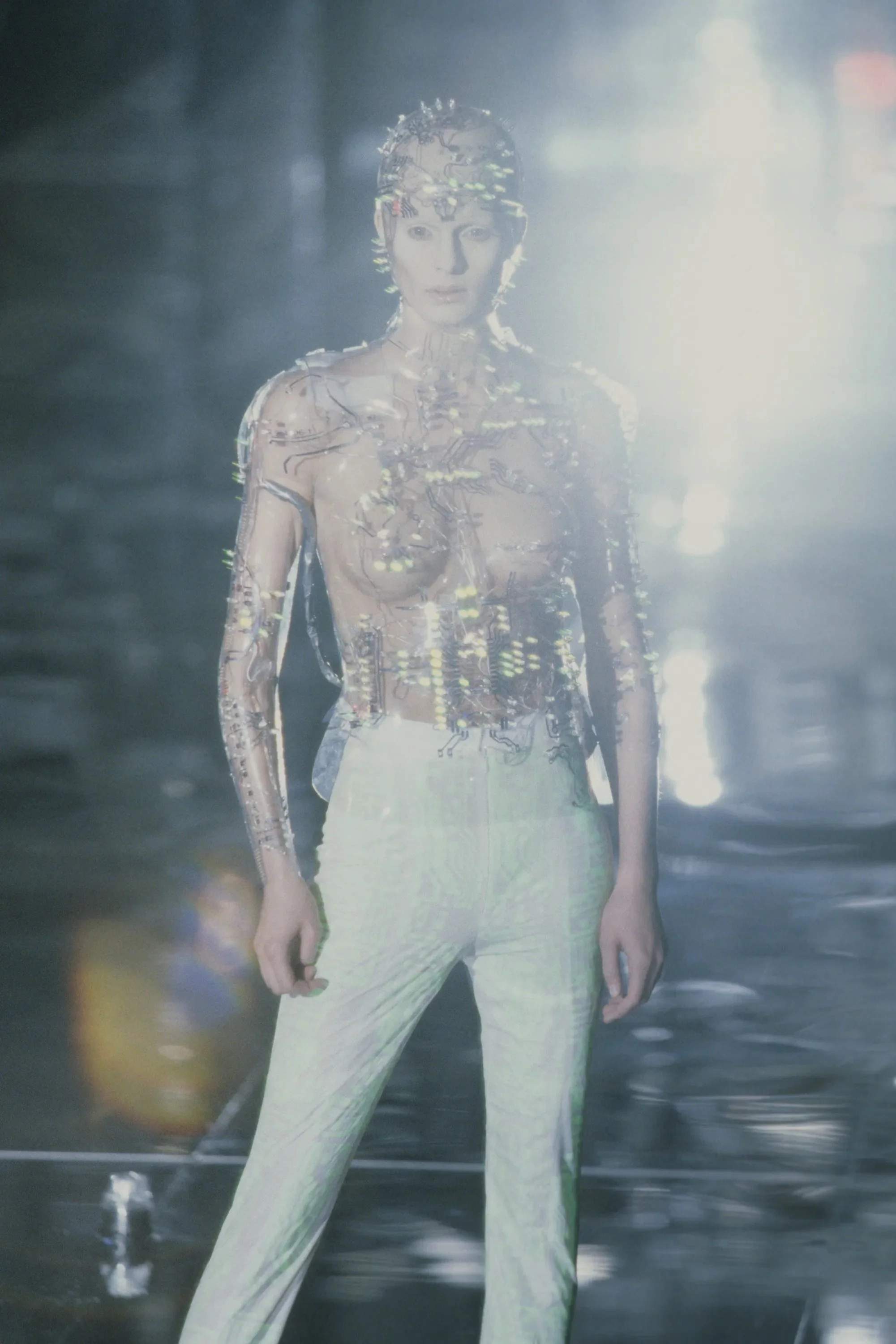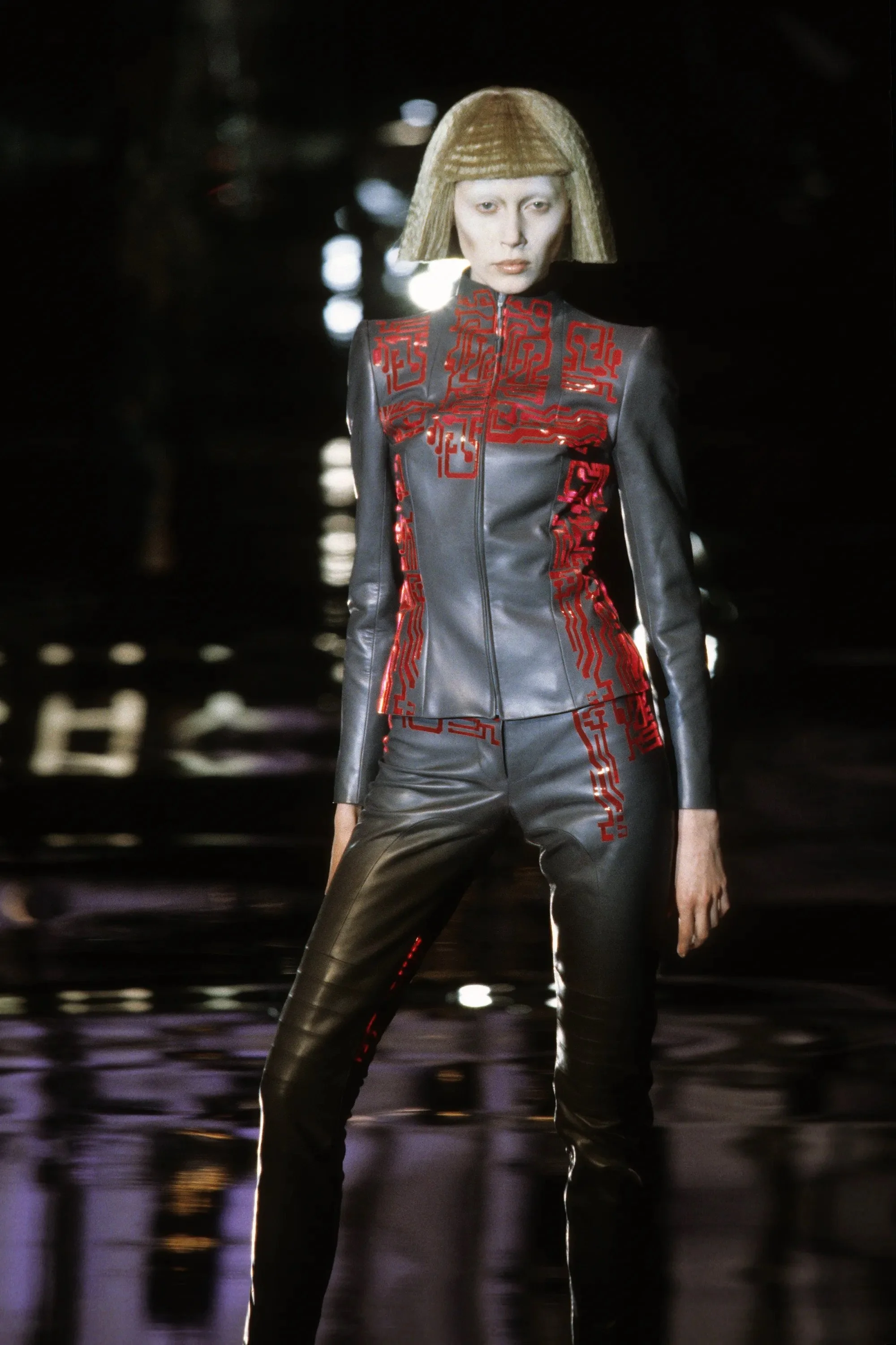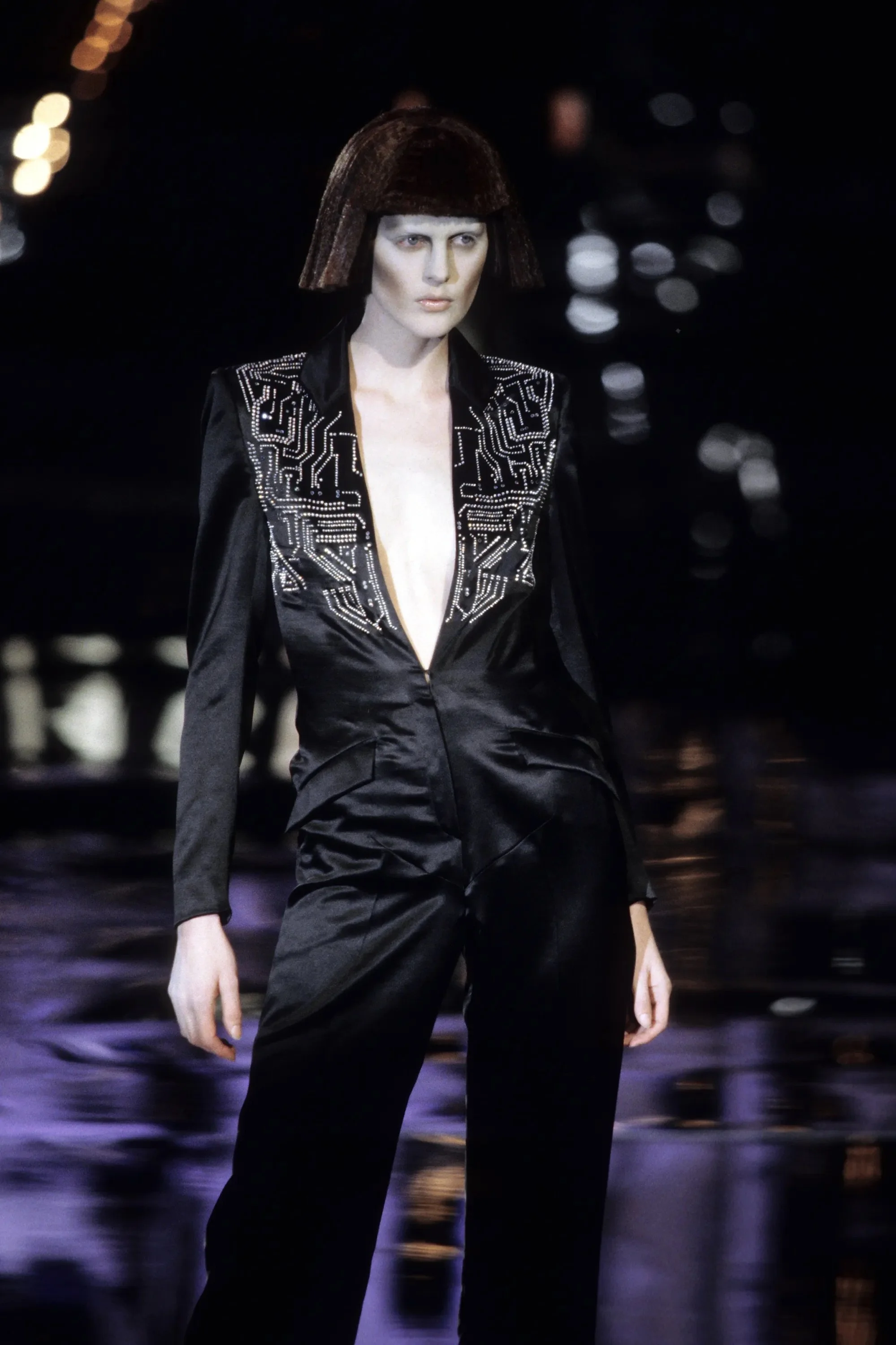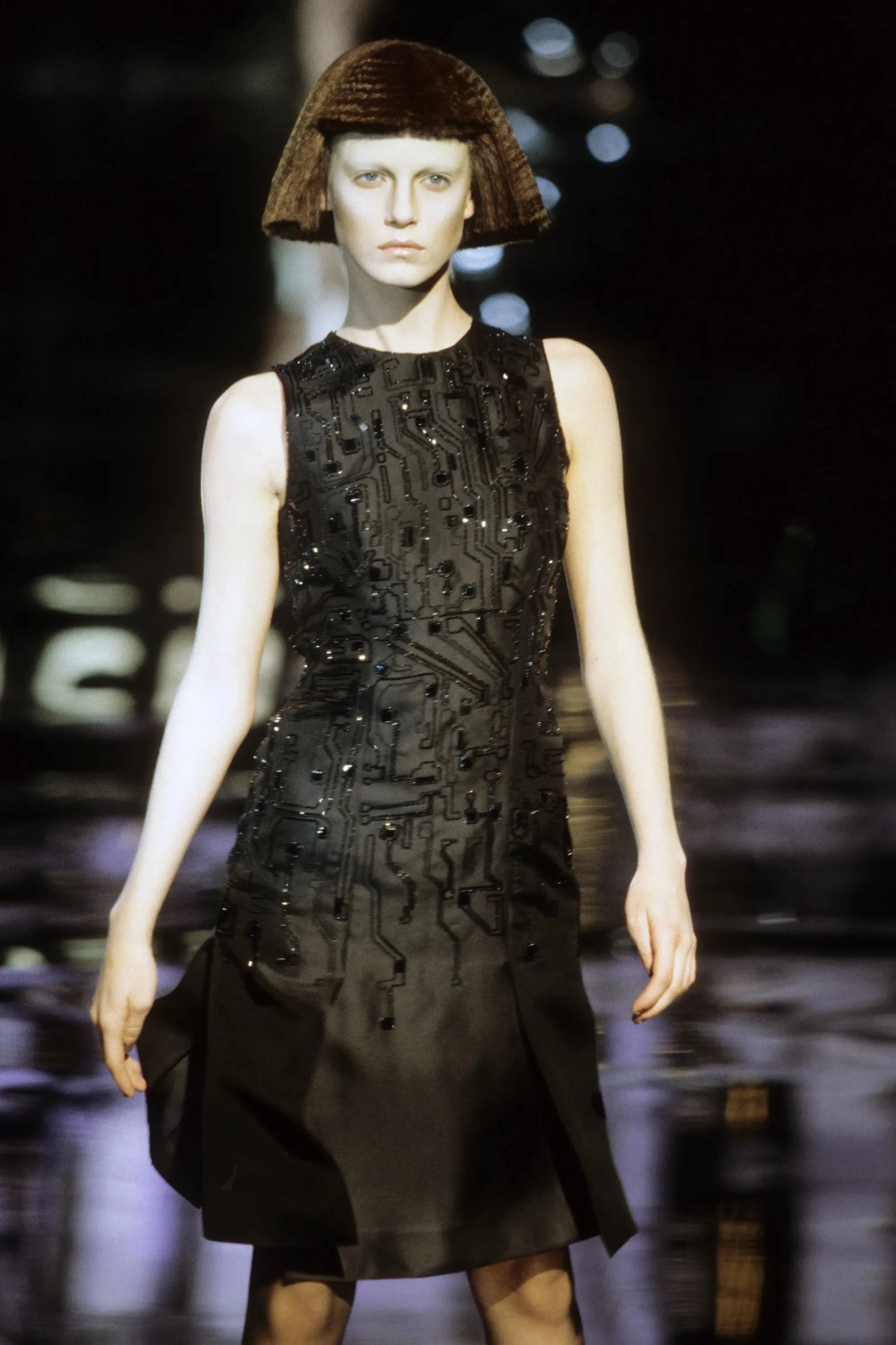 McQueen opened his collection with a laser show, and sent Tron-inspired models in what one observer described as “android couture” down a silvery mirrored runway. Embellishments, embroidered and printed, took the form of circuit boards. Glow-in-the-dark looks added drama to the show, as did the light-up finale pieces. These were made of molded clear plastic “vac-formed from plaster body casts” and fitted out with battery-powered, “programmed flashing LEDs.” The only thing missing in this bright picture of the future was shades.