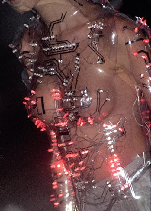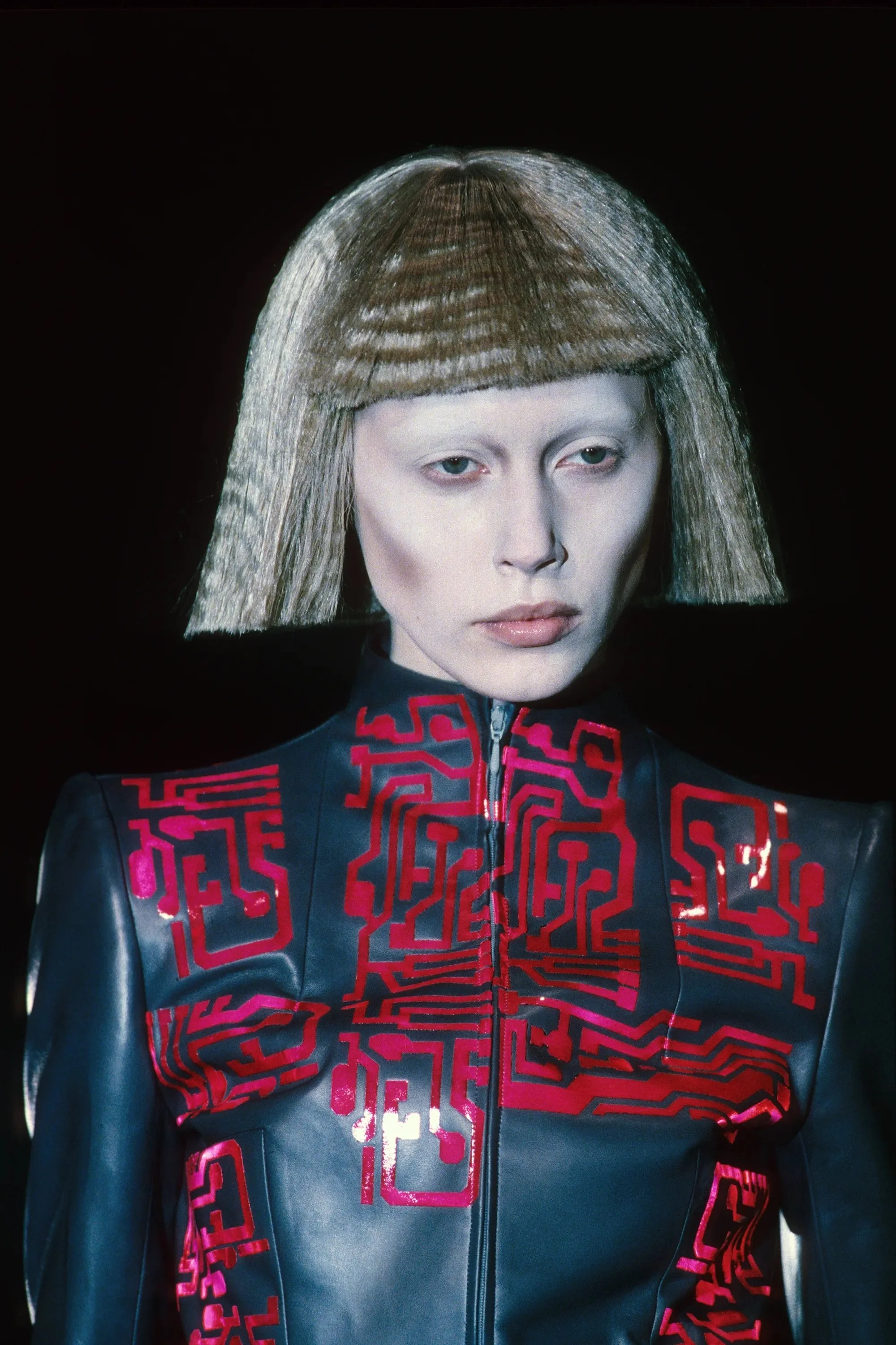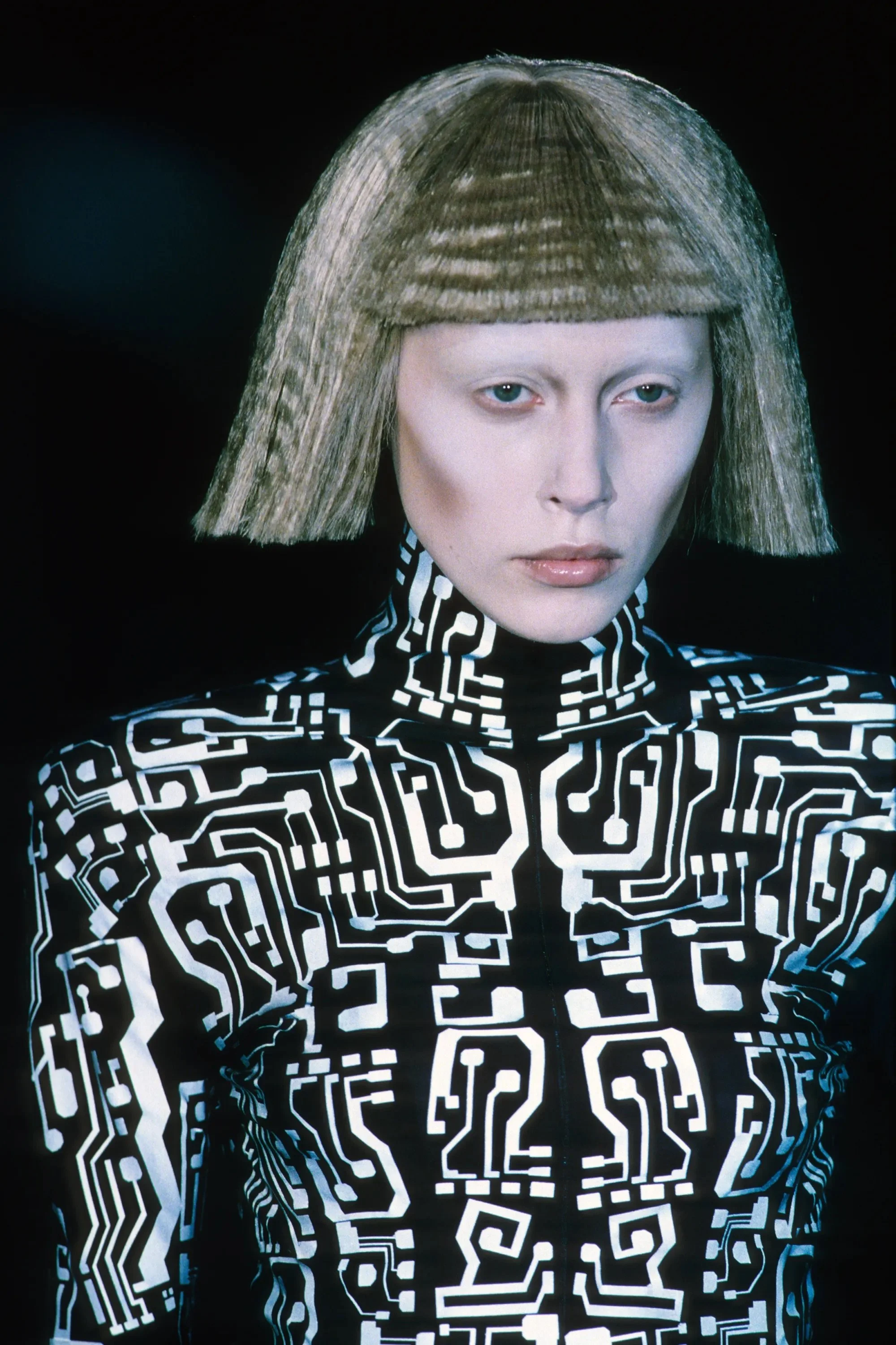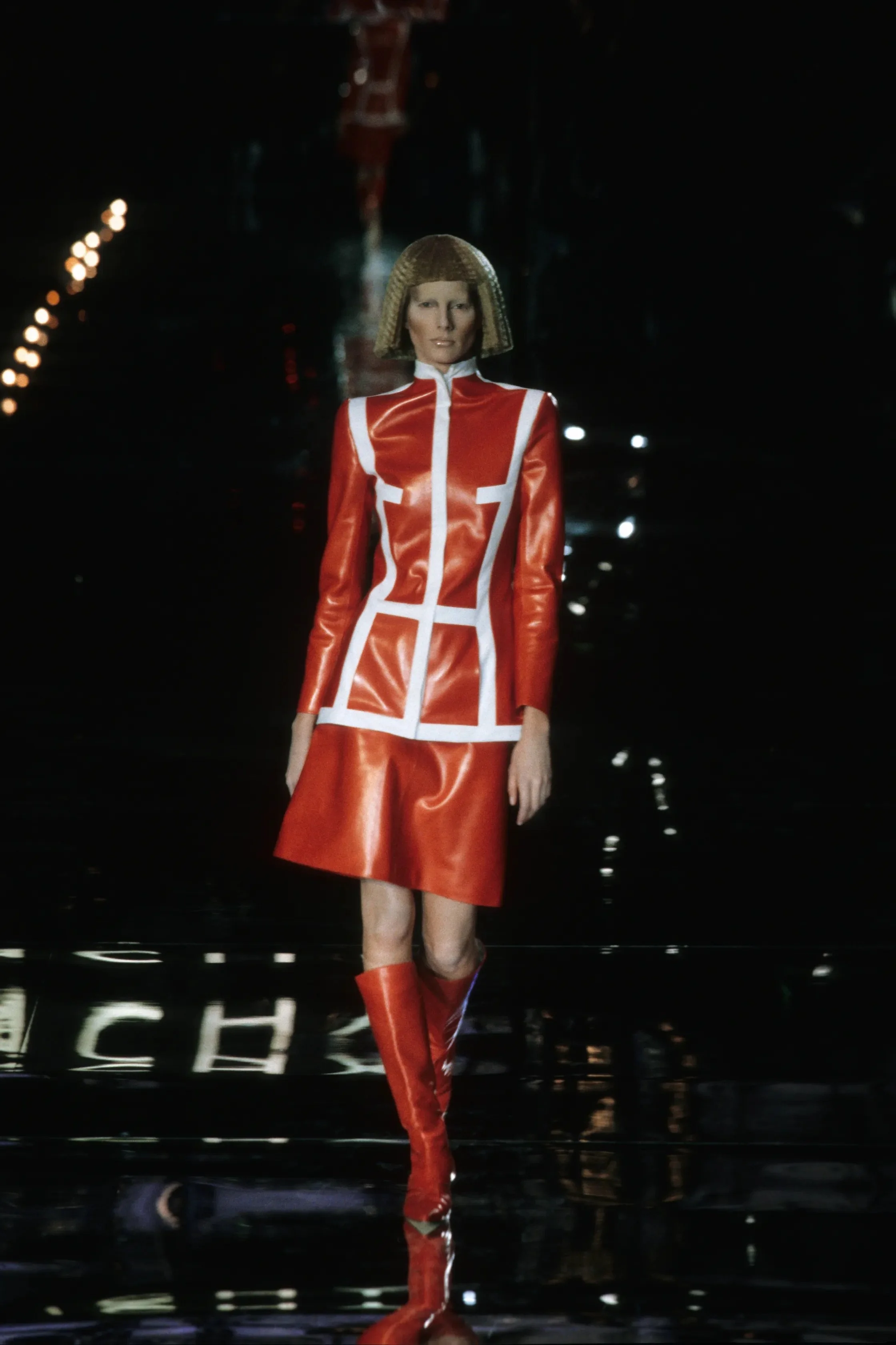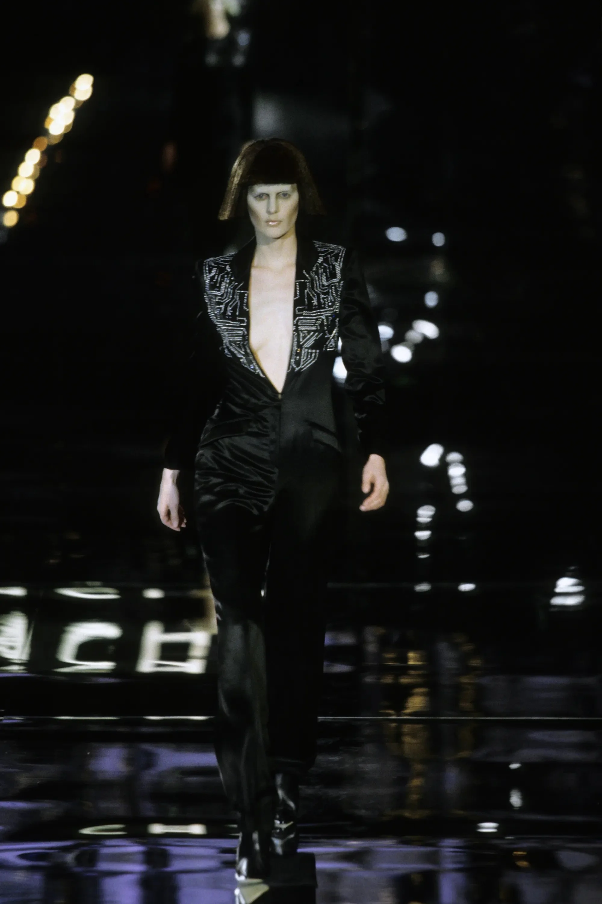 McQueen opened his collection with a laser show, and sent Tron-inspired models in what one observer described as “android couture” down a silvery mirrored runway. Embellishments, embroidered and printed, took the form of circuit boards. Glow-in-the-dark looks added drama to the show, as did the light-up finale pieces. These were made of molded clear plastic “vac-formed from plaster body casts” and fitted out with battery-powered, “programmed flashing LEDs.” The only thing missing in this bright picture of the future was shades.
