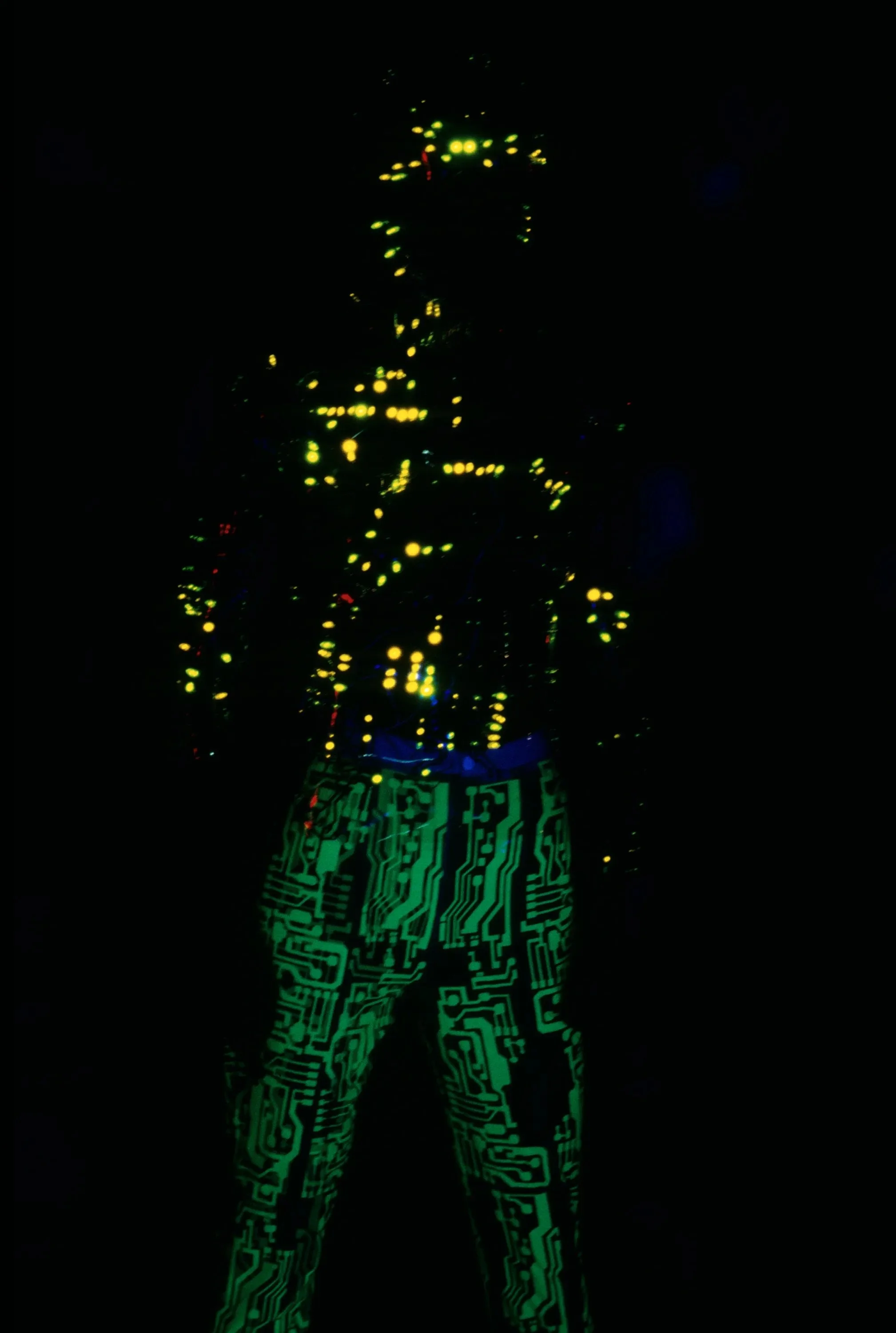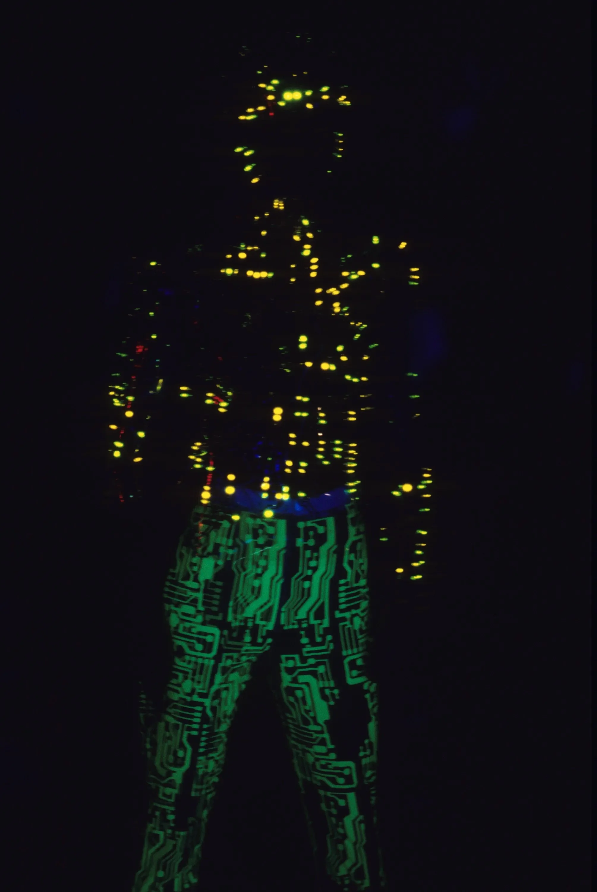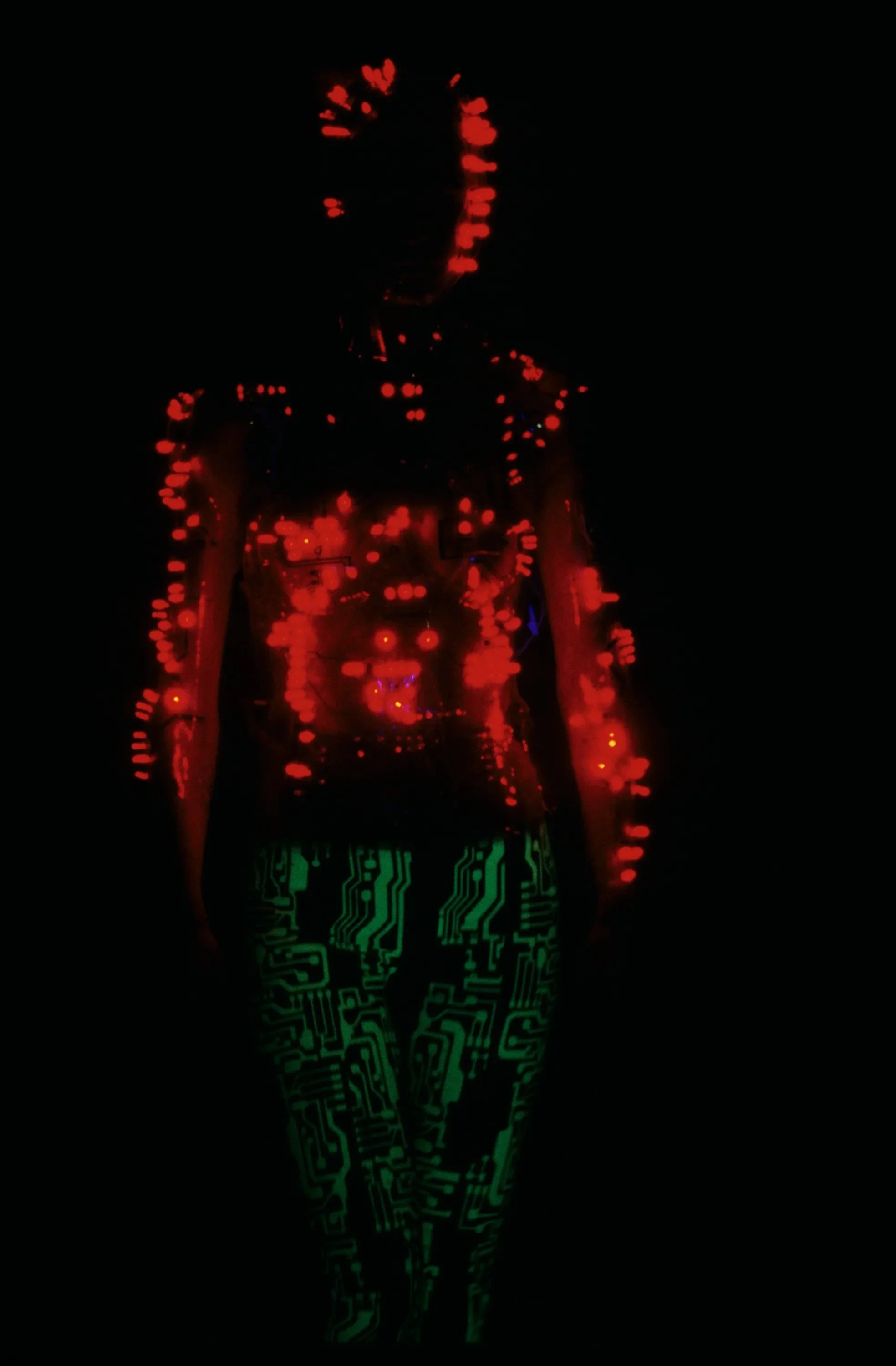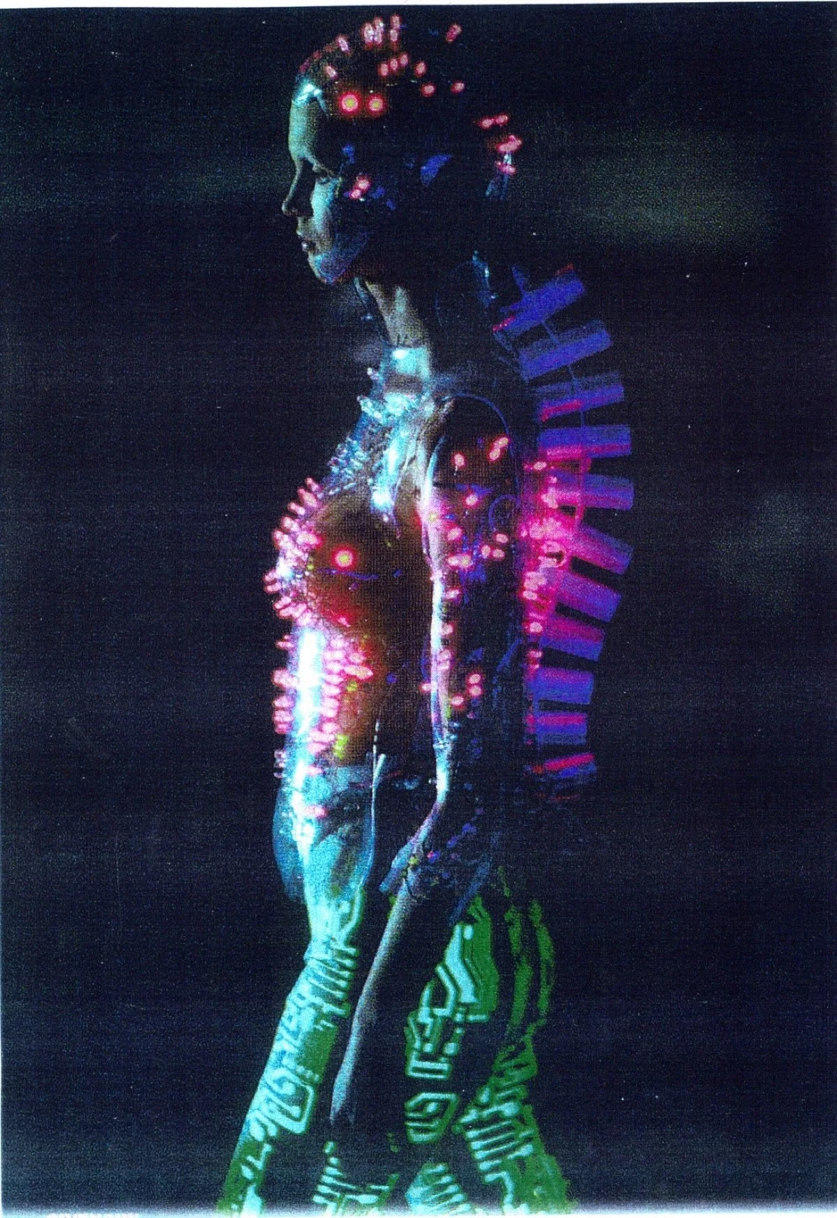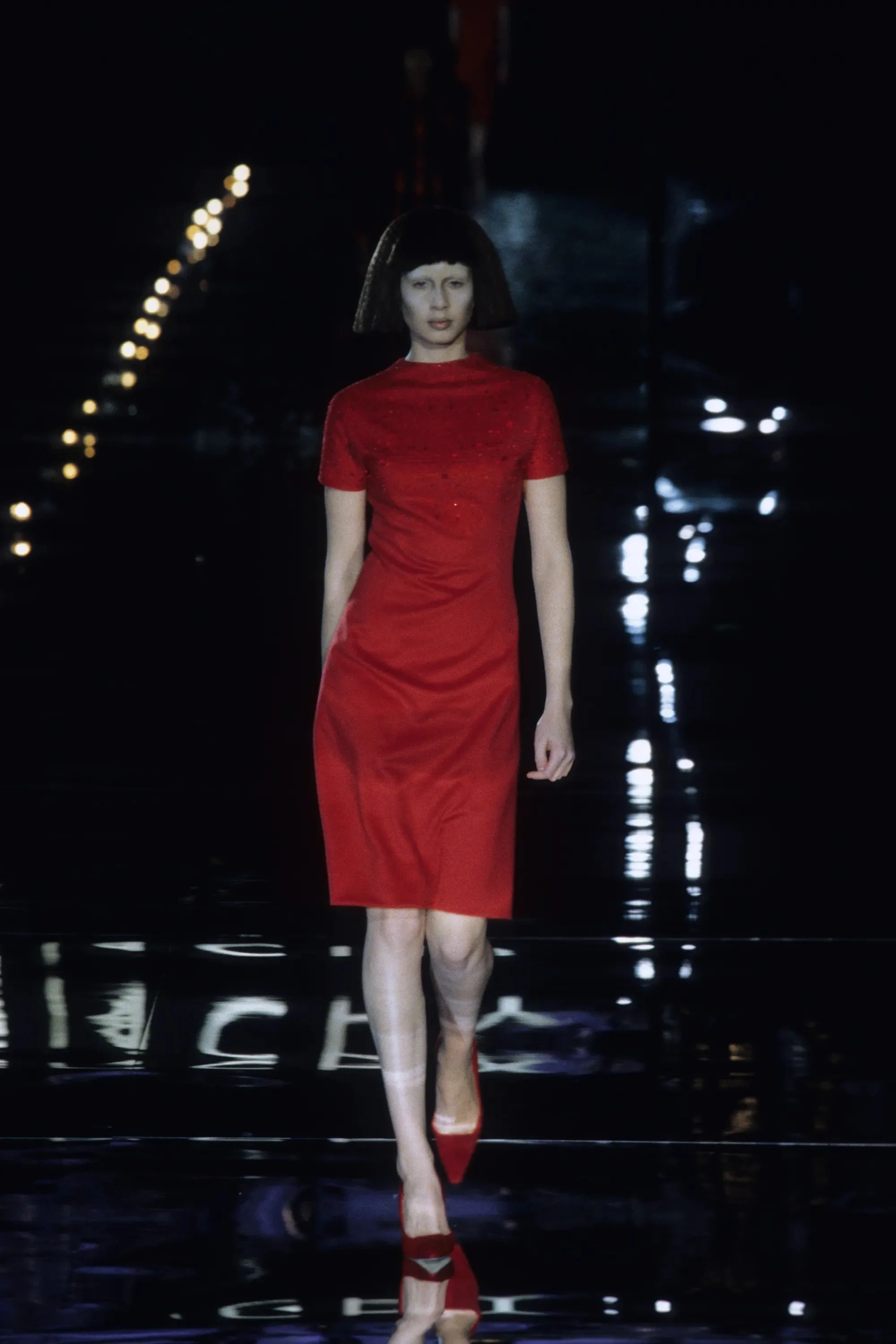 McQueen opened his collection with a laser show, and sent Tron-inspired models in what one observer described as “android couture” down a silvery mirrored runway. Embellishments, embroidered and printed, took the form of circuit boards. Glow-in-the-dark looks added drama to the show, as did the light-up finale pieces. These were made of molded clear plastic “vac-formed from plaster body casts” and fitted out with battery-powered, “programmed flashing LEDs.” The only thing missing in this bright picture of the future was shades.