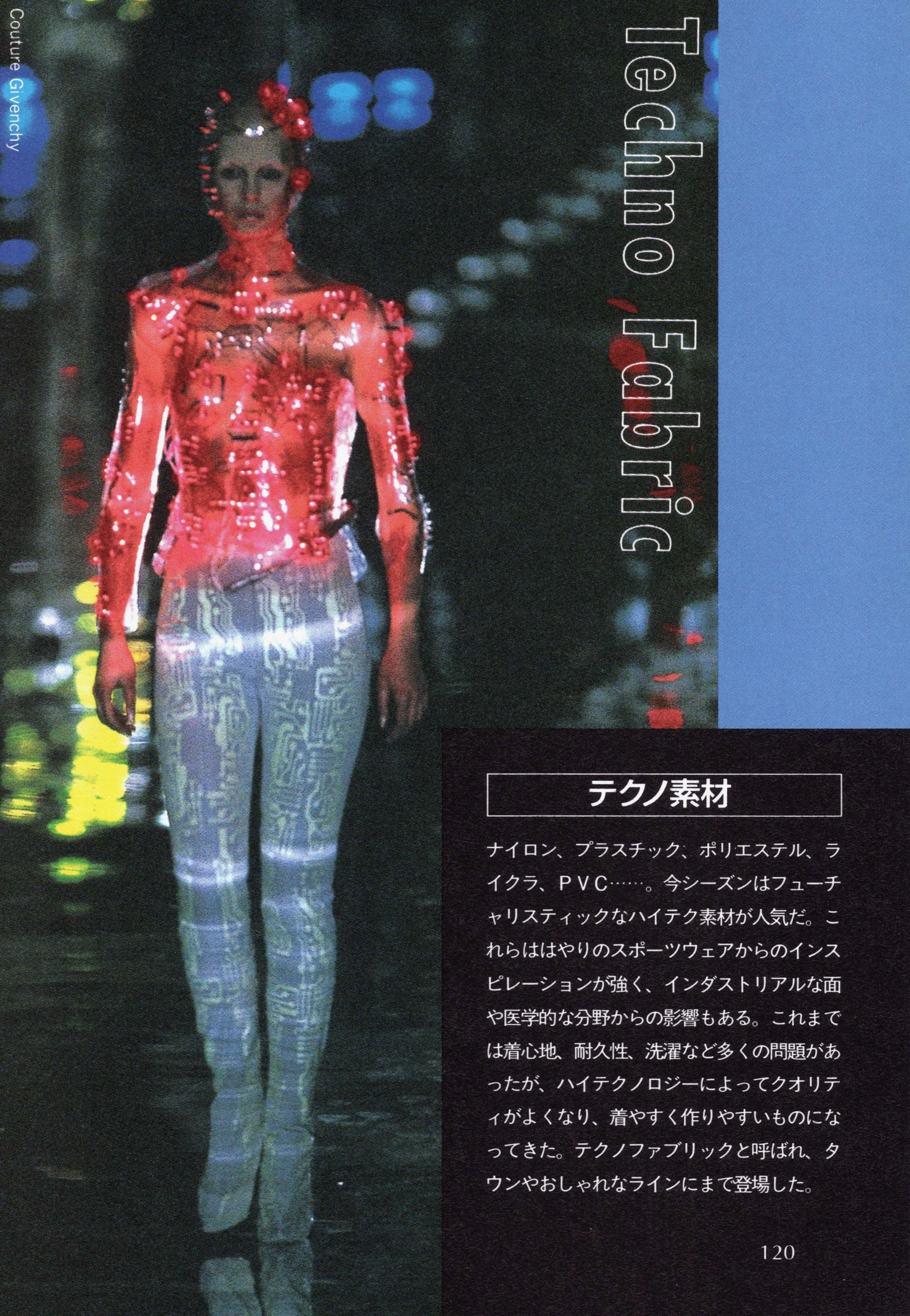 ナイロン、プラスチック、ポリエステル、ライクラ、PVC⋯⋯。今シーズンはフューチャリスティックなハイテク素材が人気だ。これらははやりのスポーツウェアからのインスピレーションが強く、インダストリアルな面や医学的な分野からの影響もある。これまでは着心地、耐久性、洗濯など多くの問題があったが、ハイテクノロジーによってクオリティがよくなり、着やすく作りやすいものになってきた。テクノファブリックと呼ばれ、タウンやおしゃれなラインにまで登場した。