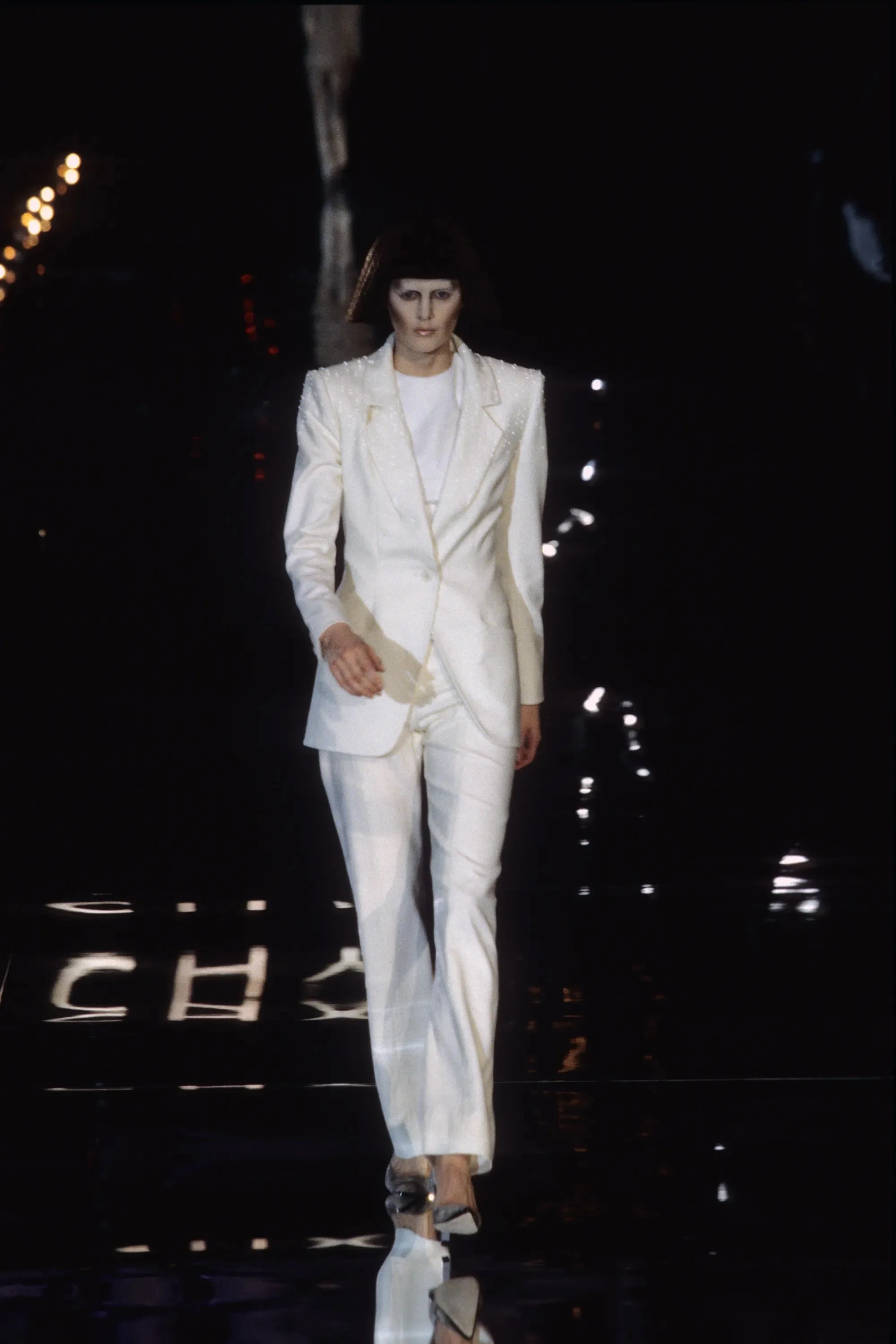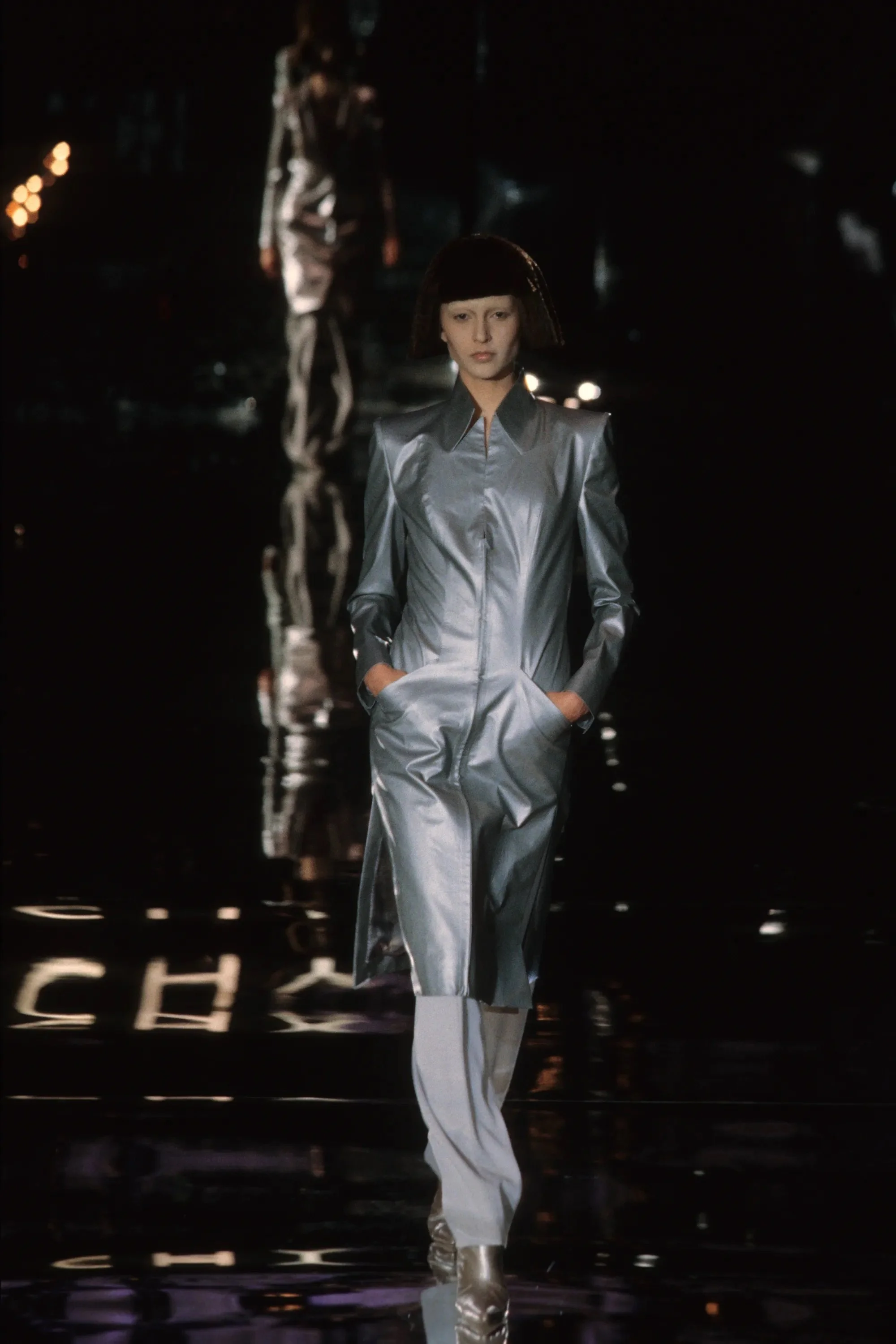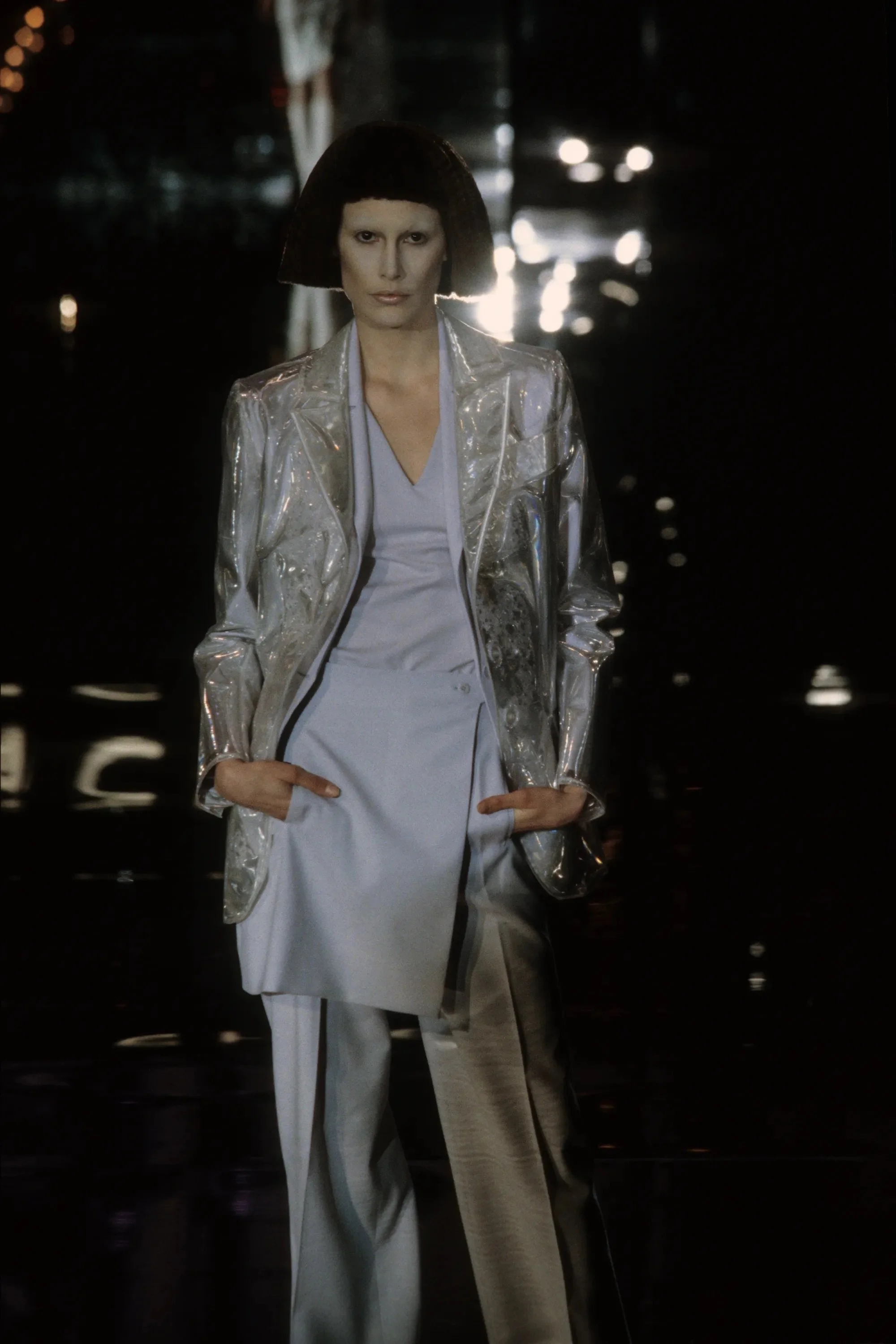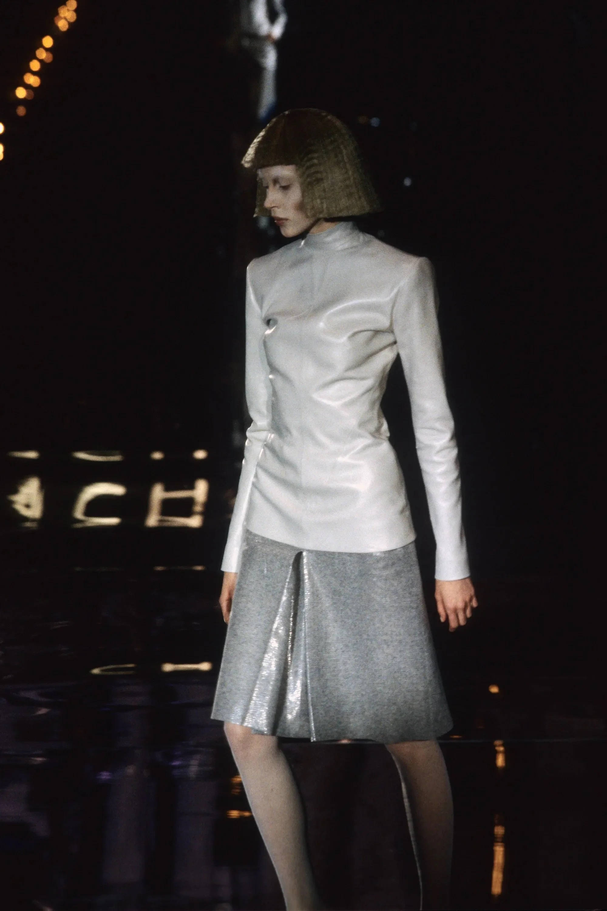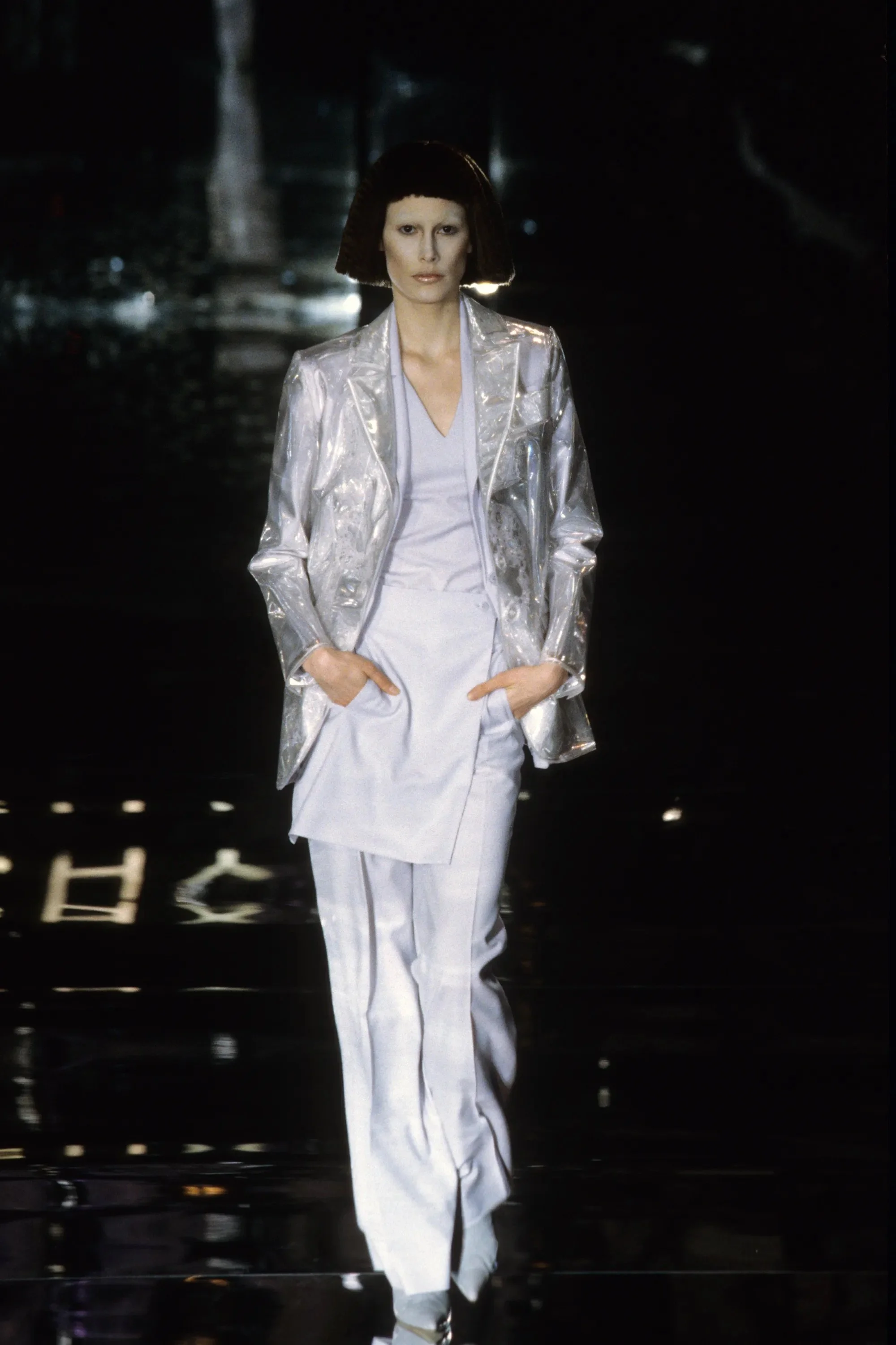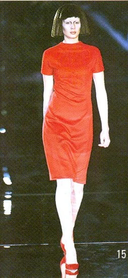 ウィンナワルツに乗って発表されたコレクションは映画「2001年宇宙の旅」(’68作)の監督で、先日逝去したスタンリー・キューブリックにささげられた。得意なテーラードのパンツスーツやコート、ジオメトリックカットのドレスなどクラシックな作品を主に、コンピューターの電子回路柄を描いたスーツやジャケットなど未来的モードがまじる。シルバーメタルやプラスチックを服の部分にも取り入れて。