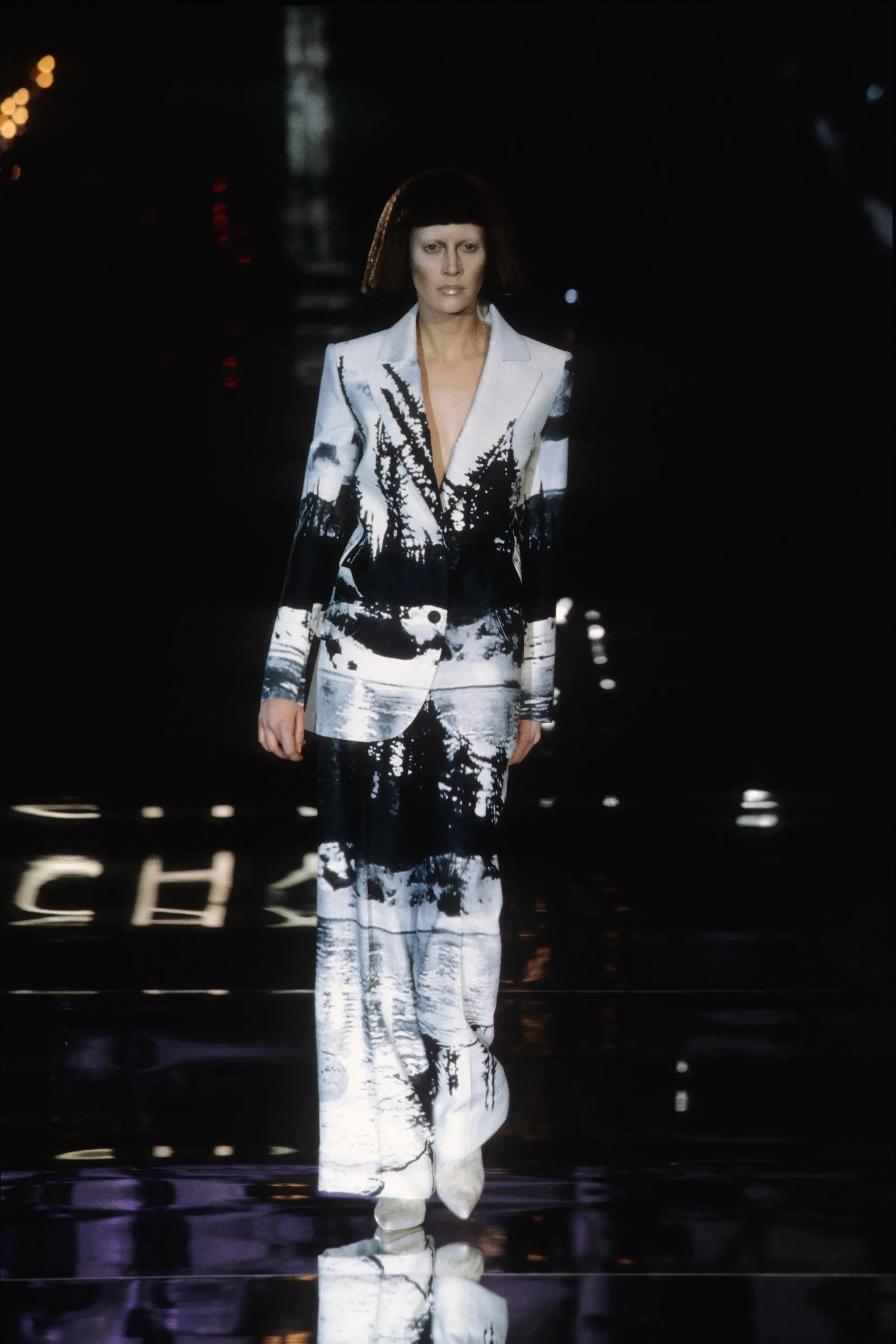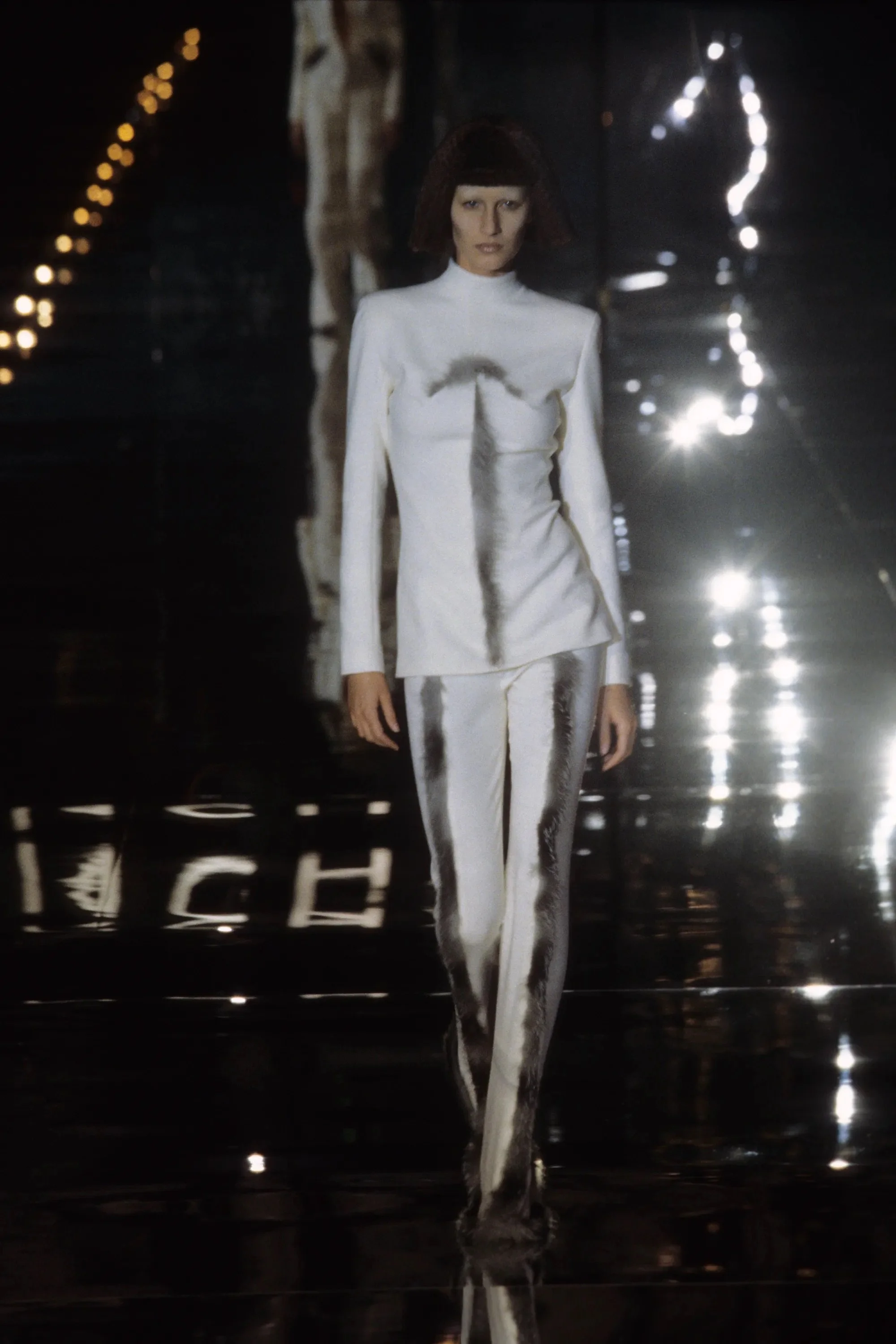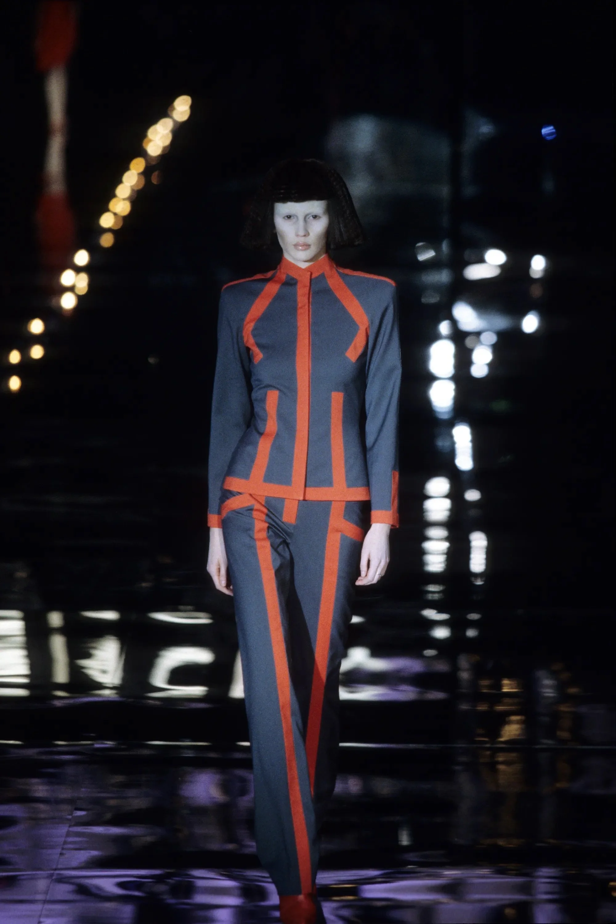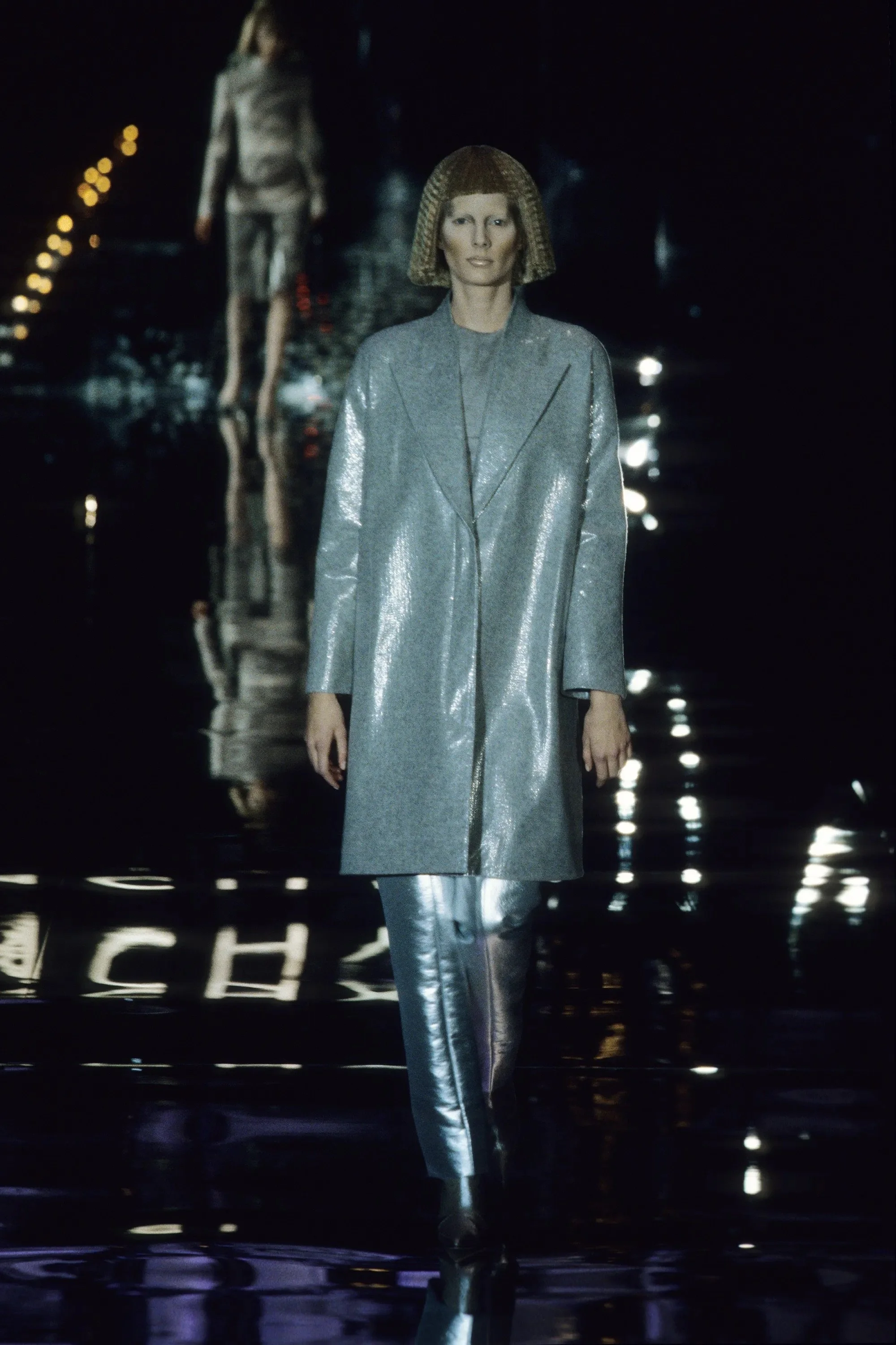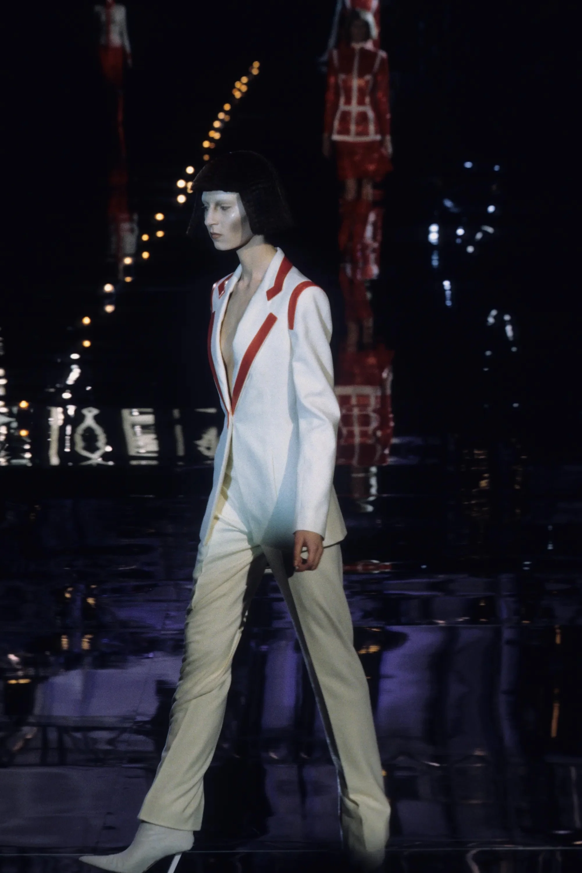 ウィンナワルツに乗って発表されたコレクションは映画「2001年宇宙の旅」(’68作)の監督で、先日逝去したスタンリー・キューブリックにささげられた。得意なテーラードのパンツスーツやコート、ジオメトリックカットのドレスなどクラシックな作品を主に、コンピューターの電子回路柄を描いたスーツやジャケットなど未来的モードがまじる。シルバーメタルやプラスチックを服の部分にも取り入れて。
