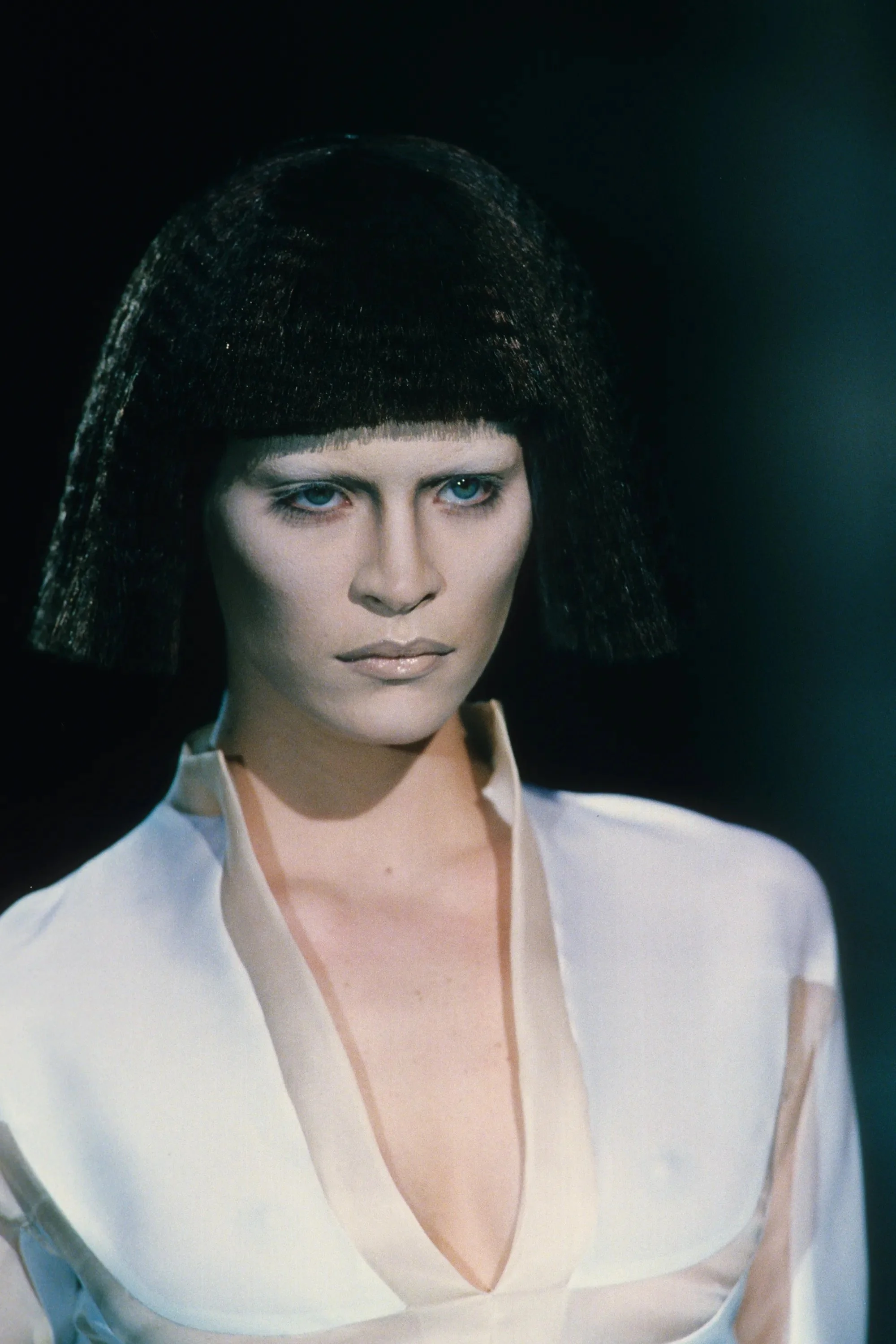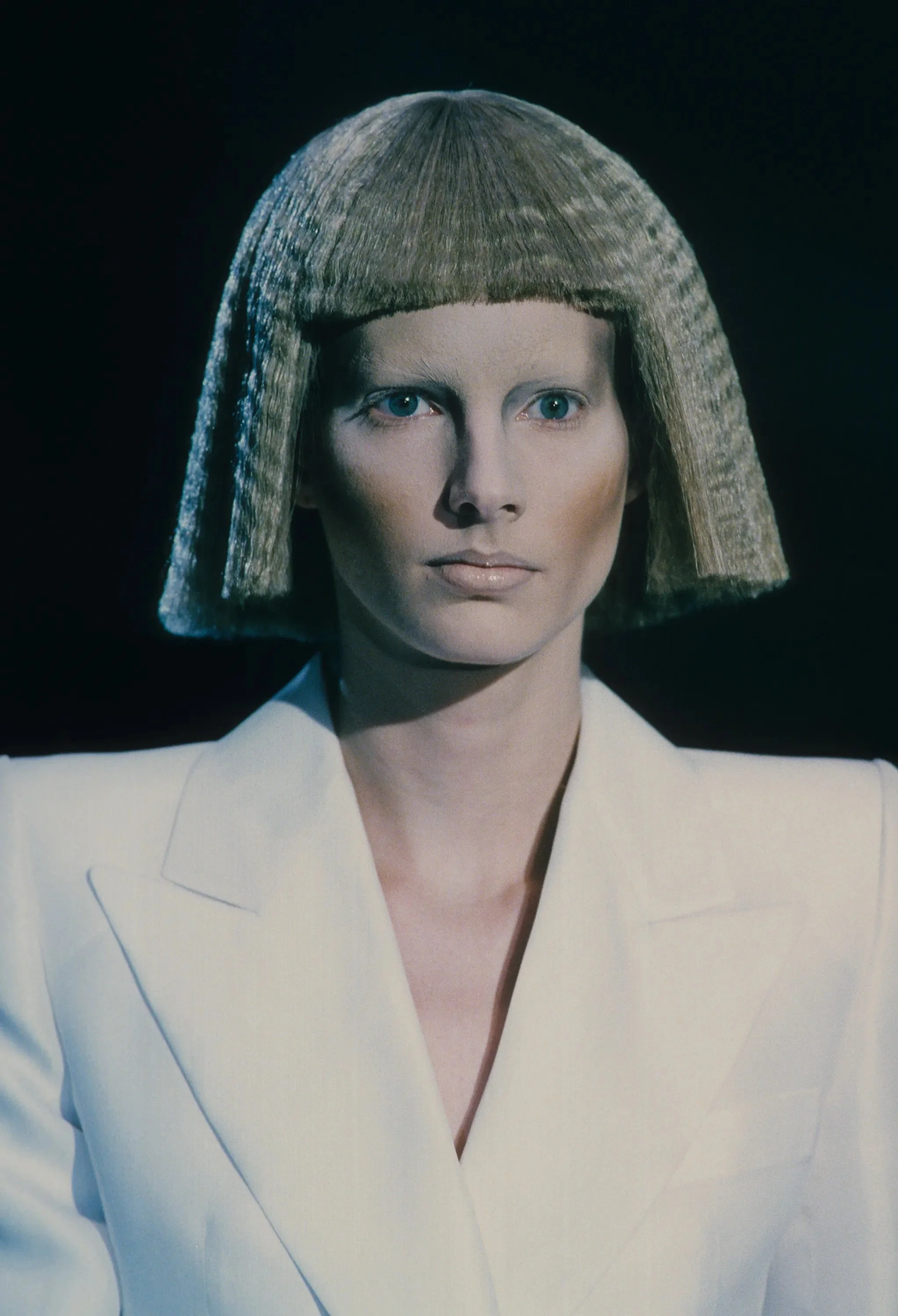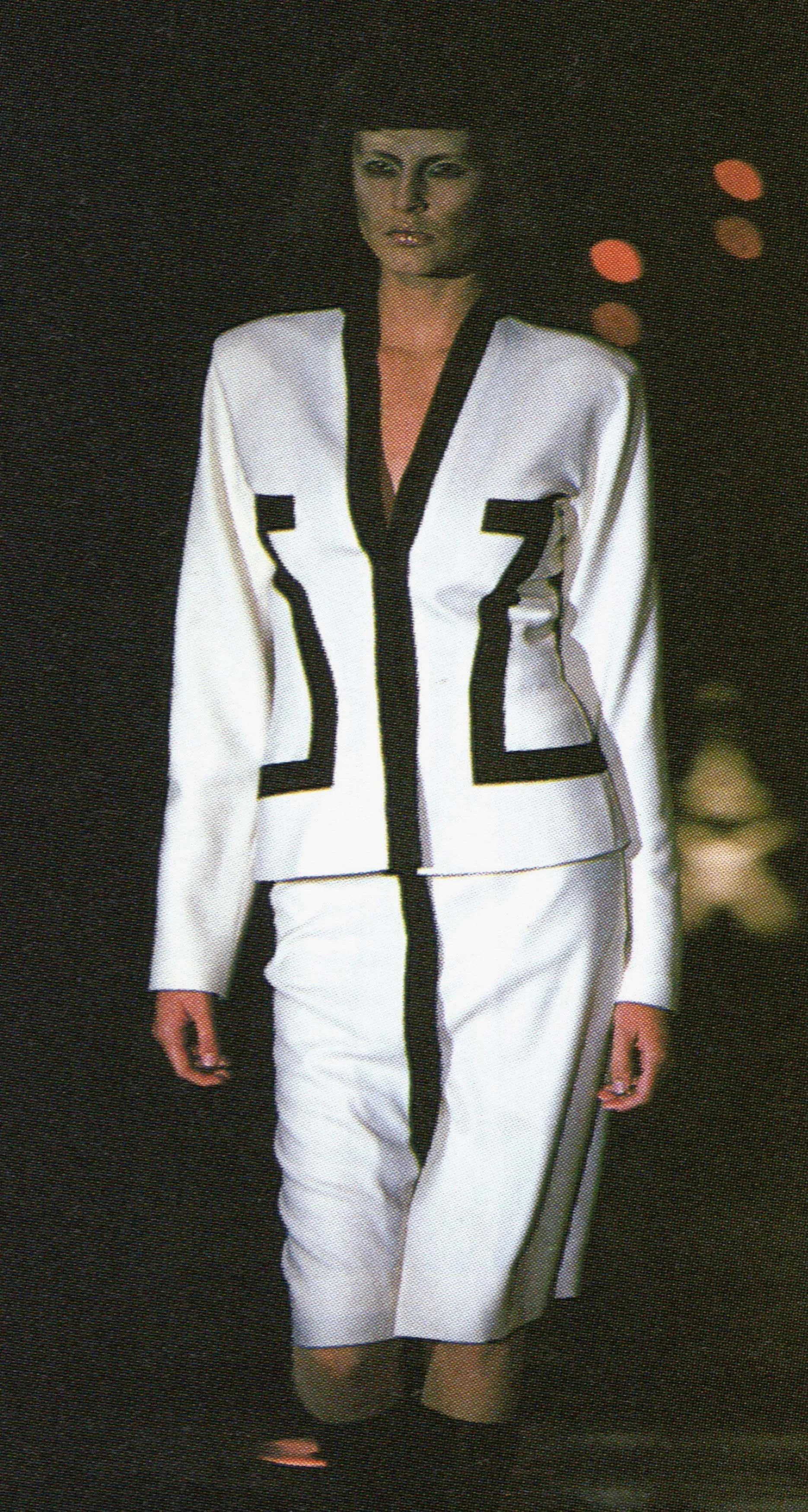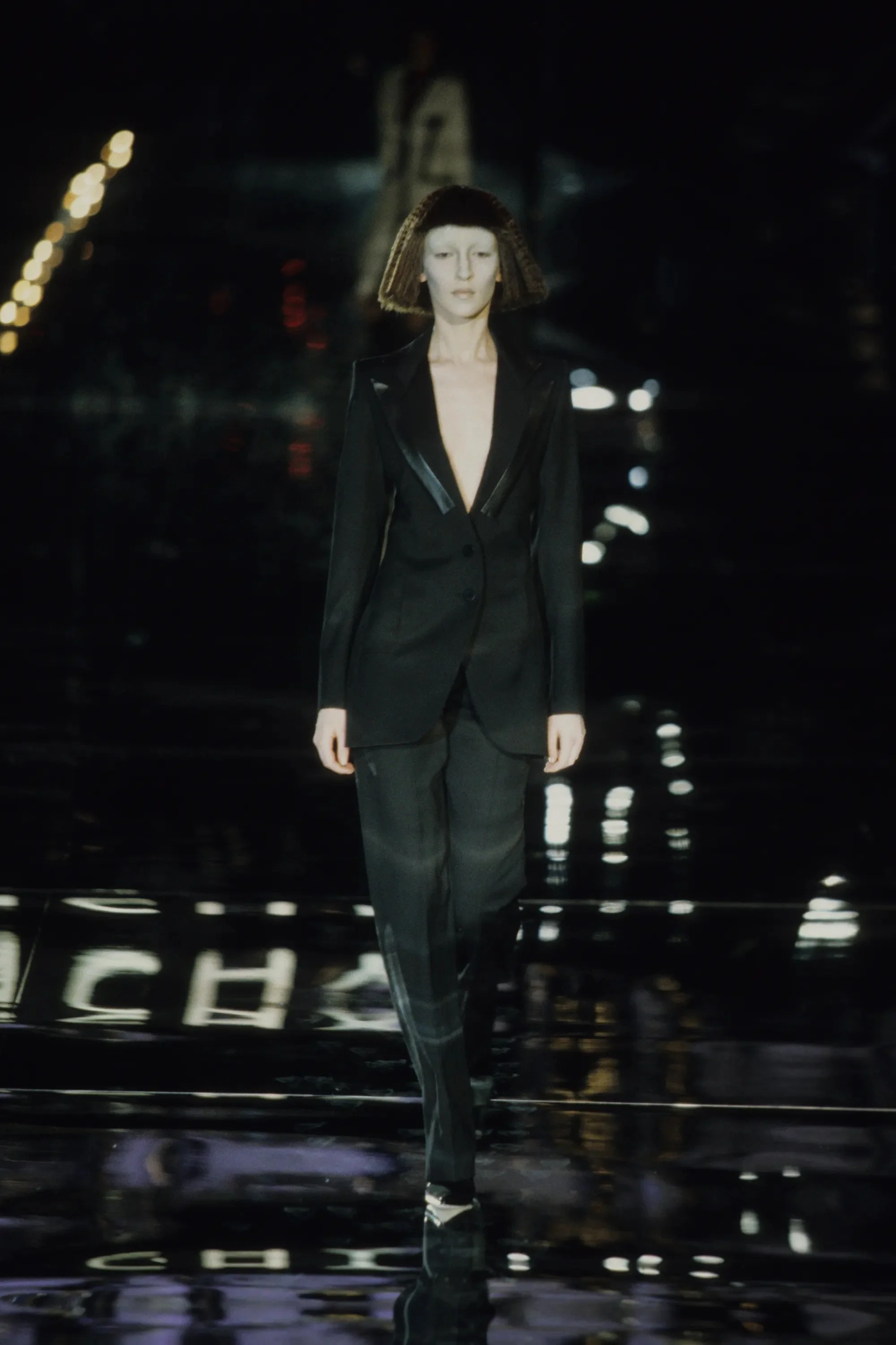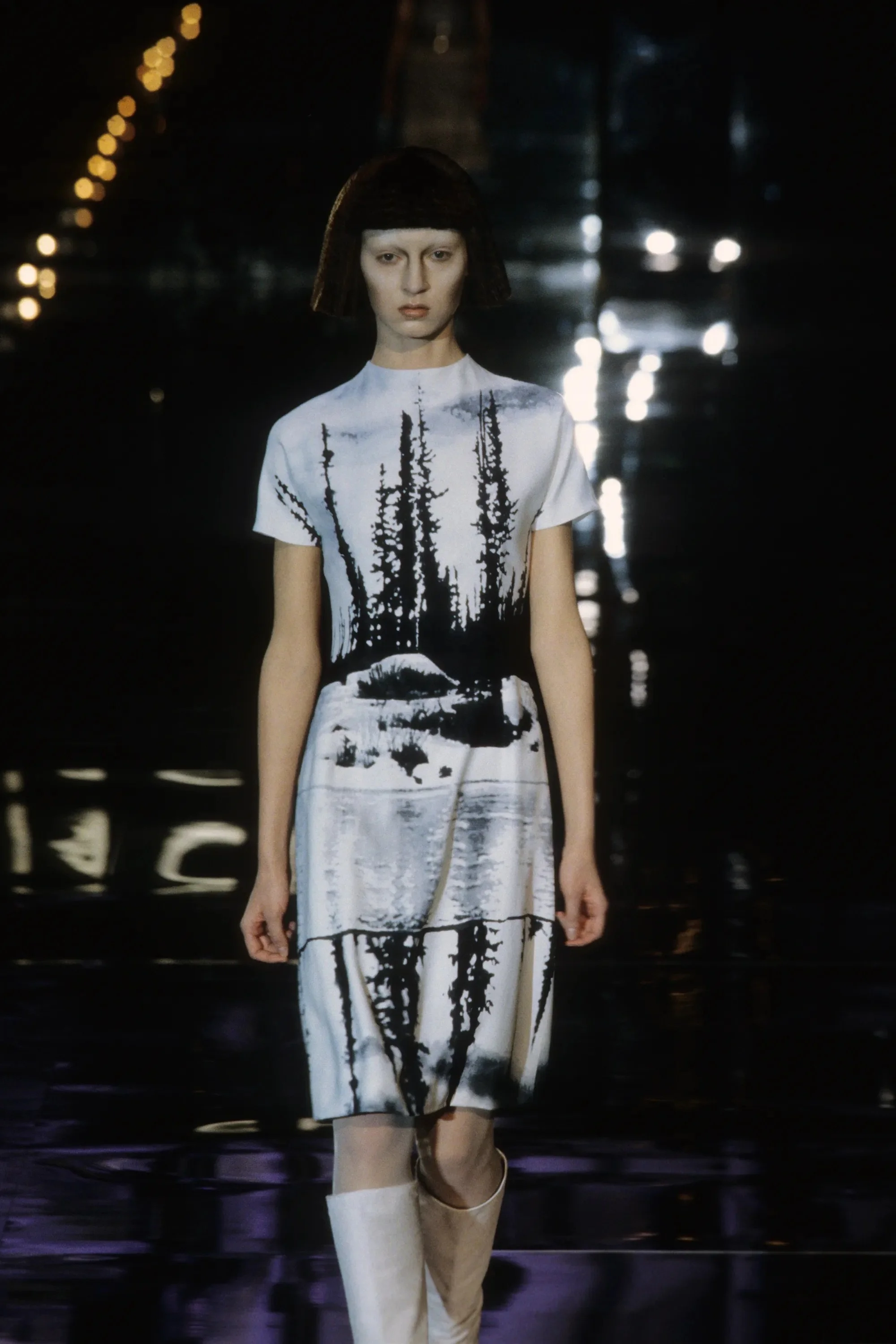 ウィンナワルツに乗って発表されたコレクションは映画「2001年宇宙の旅」(’68作)の監督で、先日逝去したスタンリー・キューブリックにささげられた。得意なテーラードのパンツスーツやコート、ジオメトリックカットのドレスなどクラシックな作品を主に、コンピューターの電子回路柄を描いたスーツやジャケットなど未来的モードがまじる。シルバーメタルやプラスチックを服の部分にも取り入れて。
