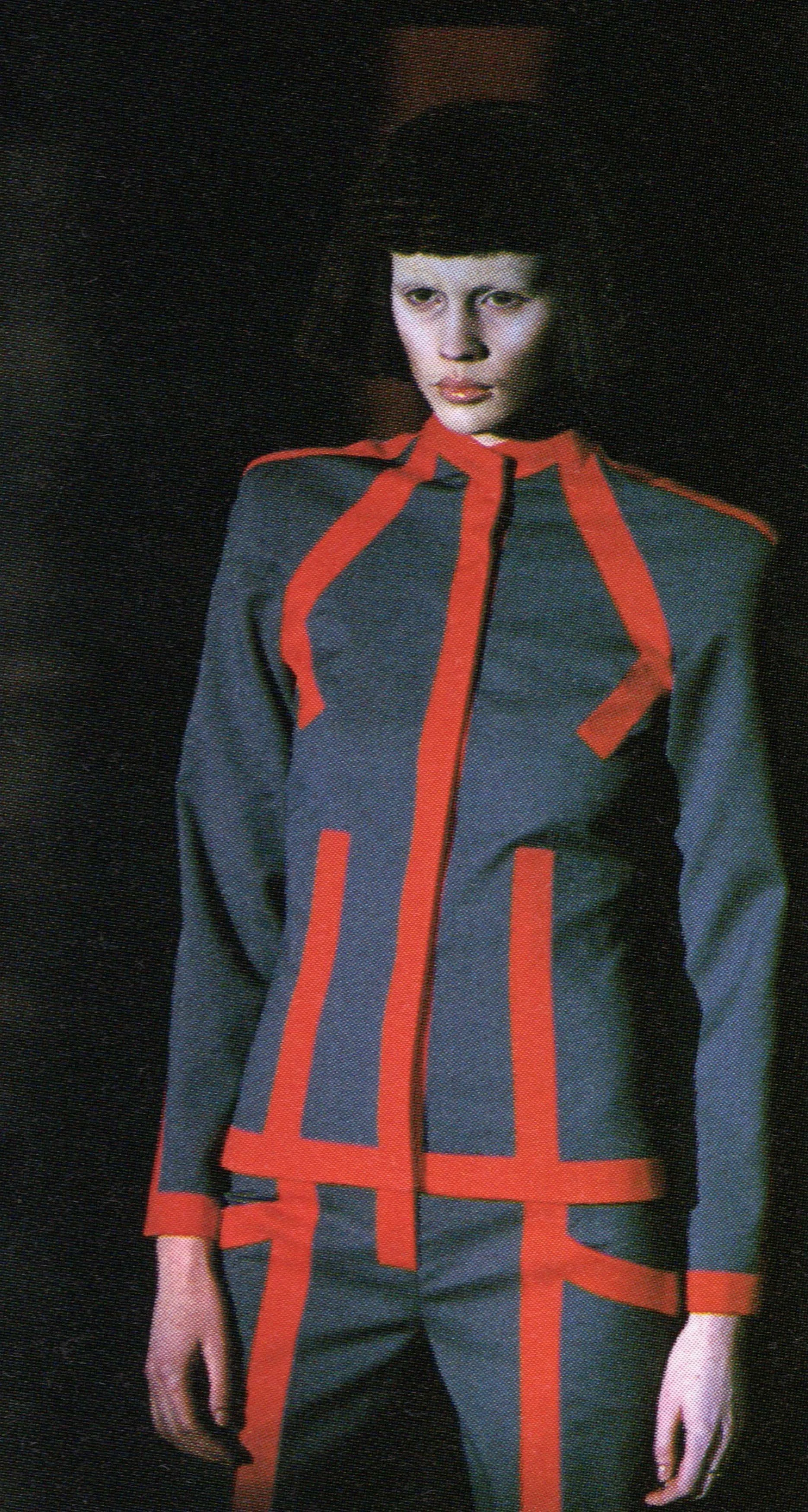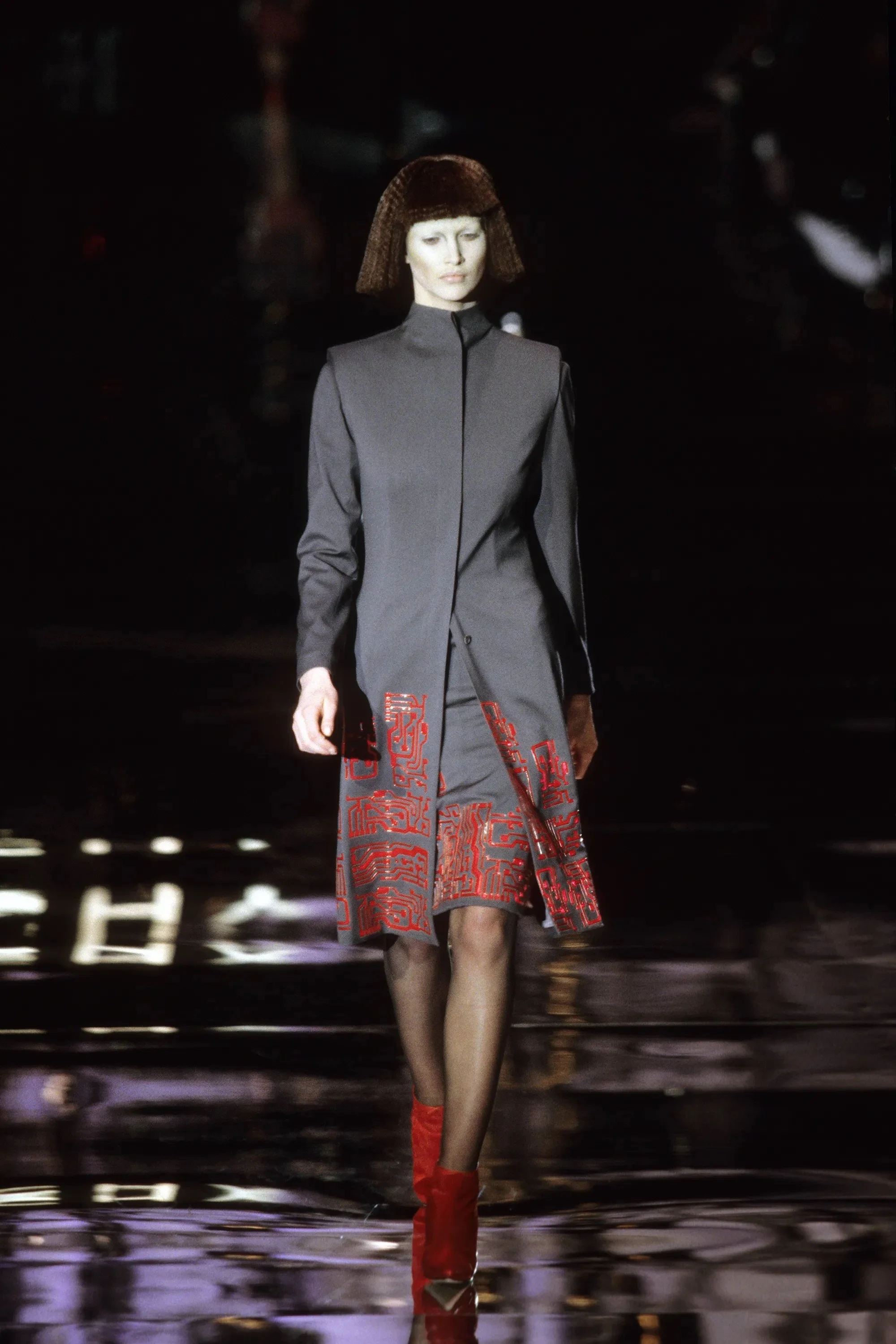 Launched on the Viennese waltz, the collection was dedicated to Stanley Kubrick, the director of the movie "2001: A Space Odyssey" ('68), who recently passed away. Classic pieces such as tailored suit pants, coats, and geometric cut dresses, which are his specialty, were mixed with futuristic fashion such as suits and jackets with computer electronic circuit patterns. Silver metal and plastic are also incorporated into the clothing.