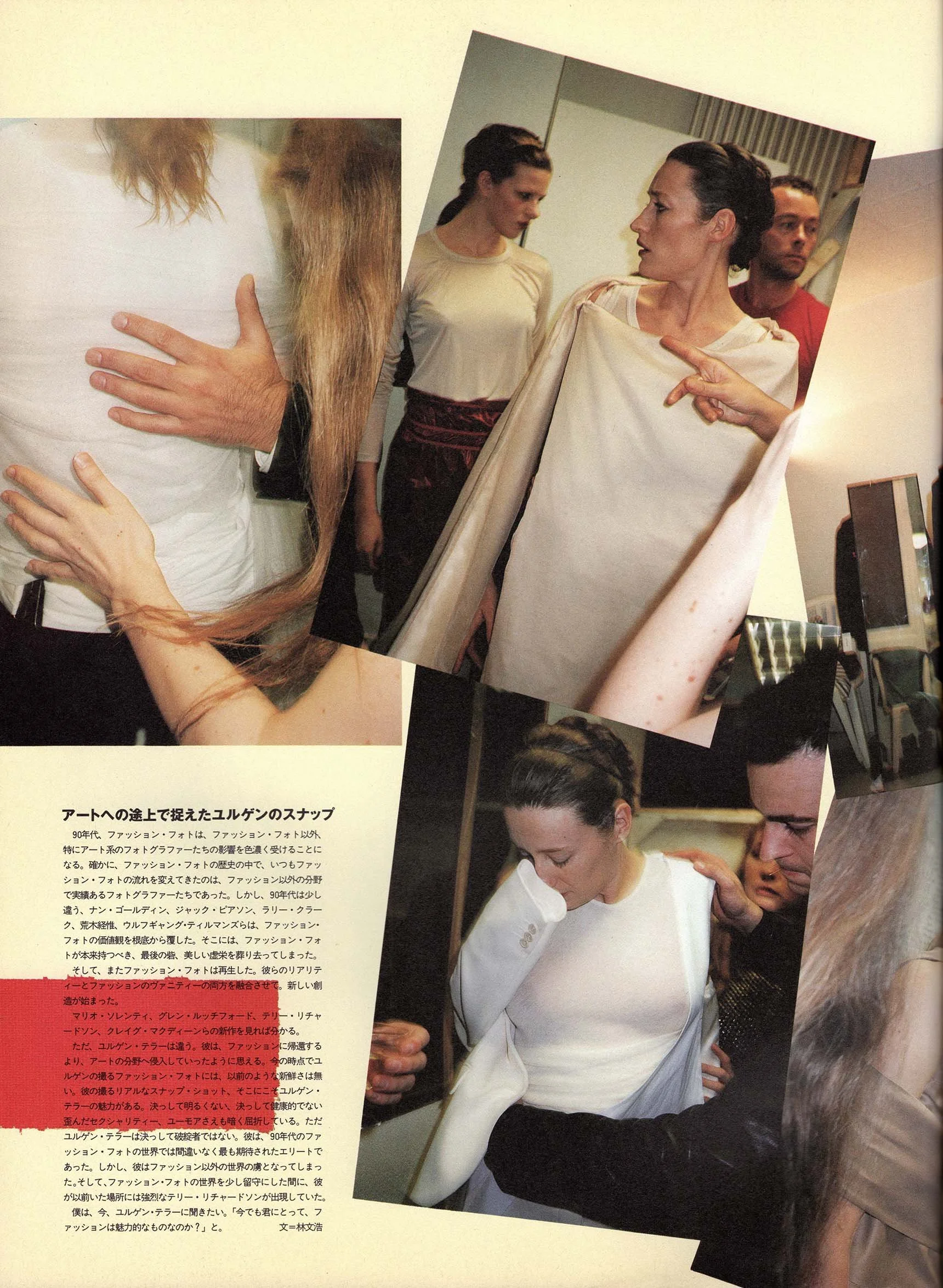 ただ、ユルゲン・テラーは違う。彼は、ファッションに帰還するより、アートの分野へ侵入していったように思える。今の時点でユルゲンの撮るファッション・フォトには、以前のような新鮮さは無い。彼の撮るリアルなスナップ・ショット、そこにこそユルゲン・テラーの魅力がある。決っして明るくない、決っして健康的でない歪んだセクシャリティー、ユーモアさえも暗く屈折している。ただユルゲン・テラーは決っして破綻者ではない。彼は、90年代のファッション・フォトの世界では間違いなく最も期待されたエリートであった。しかし、彼はファッション以外の世界の虜となってしまった。そして、ファッション・フォトの世界を少し留守にした間に、彼が以前いた場所には強烈なテリー・リチャードソンが出現していた。