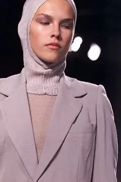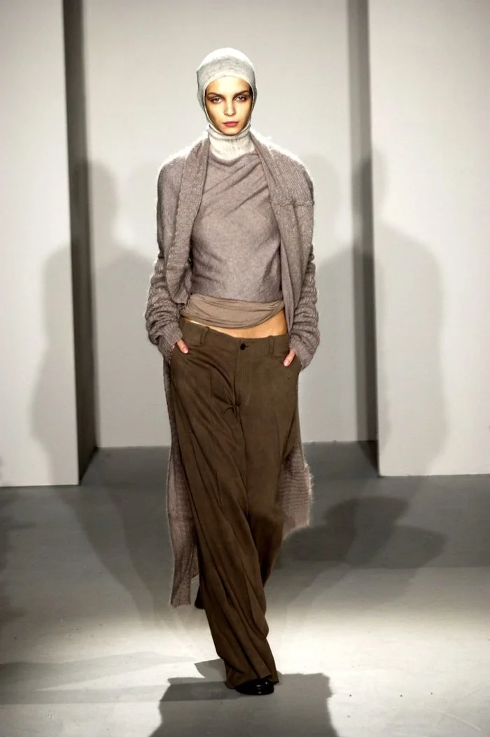Owens pays as much attention to the back of a garment as its front, creating fishtail trains and clever details, like an unexpected hood made from a swell of fabric. Most outfits were topped by a monkish balaclava helmet, emphasizing the elongated, flowing silhouette and lending a cultish, otherworldly air to the proceedings.