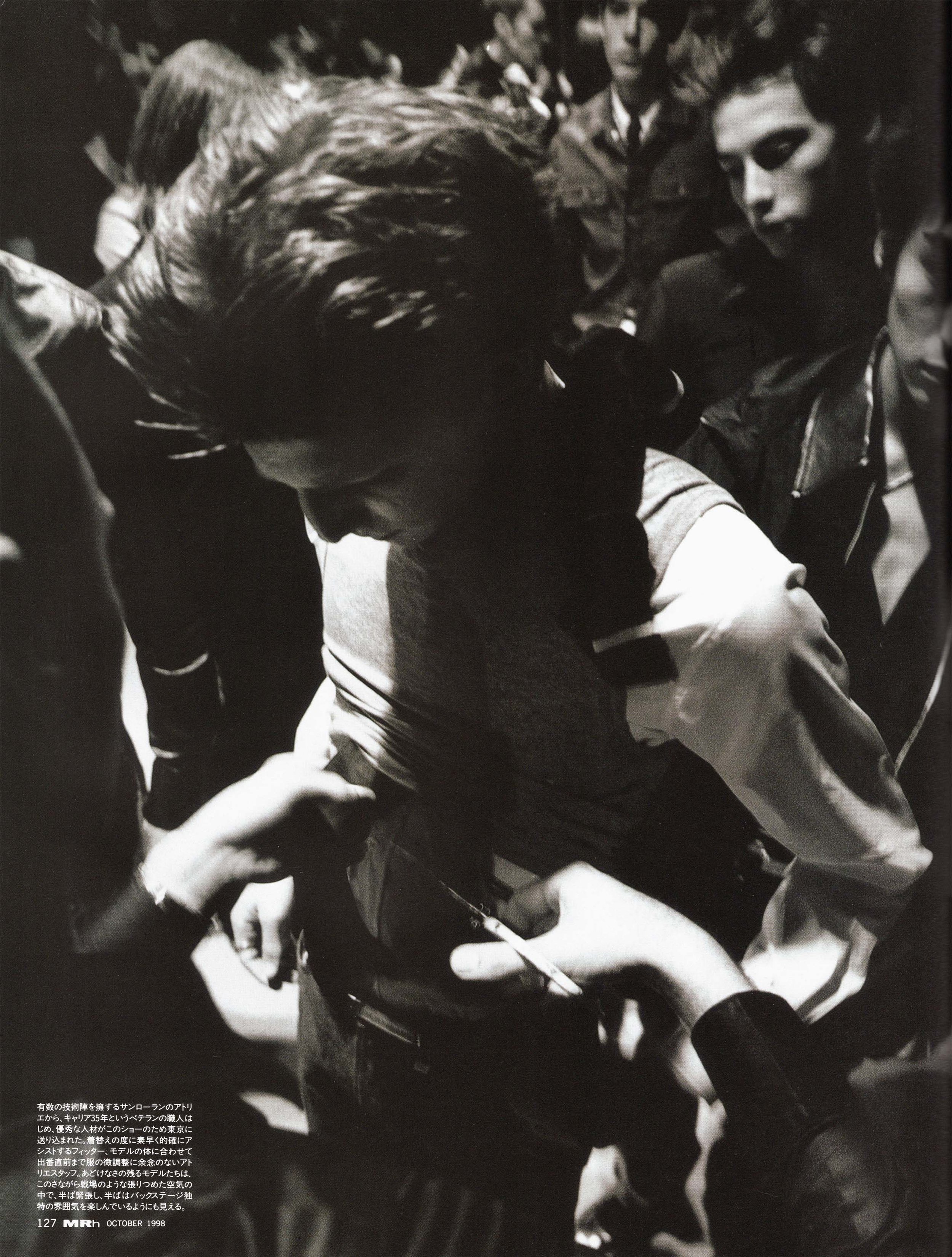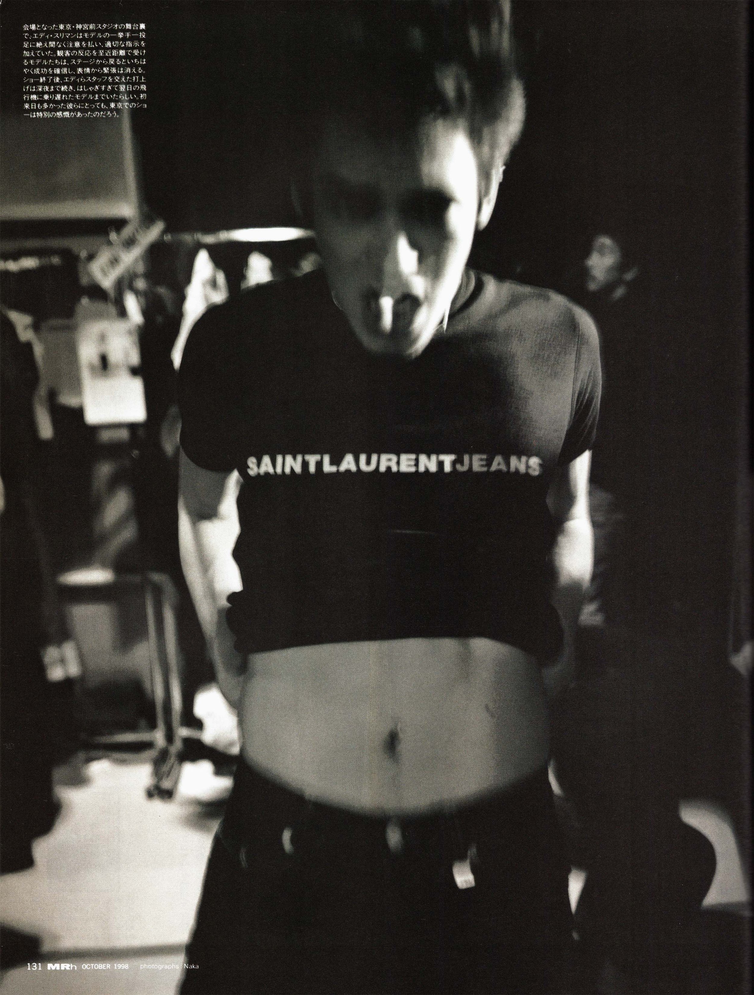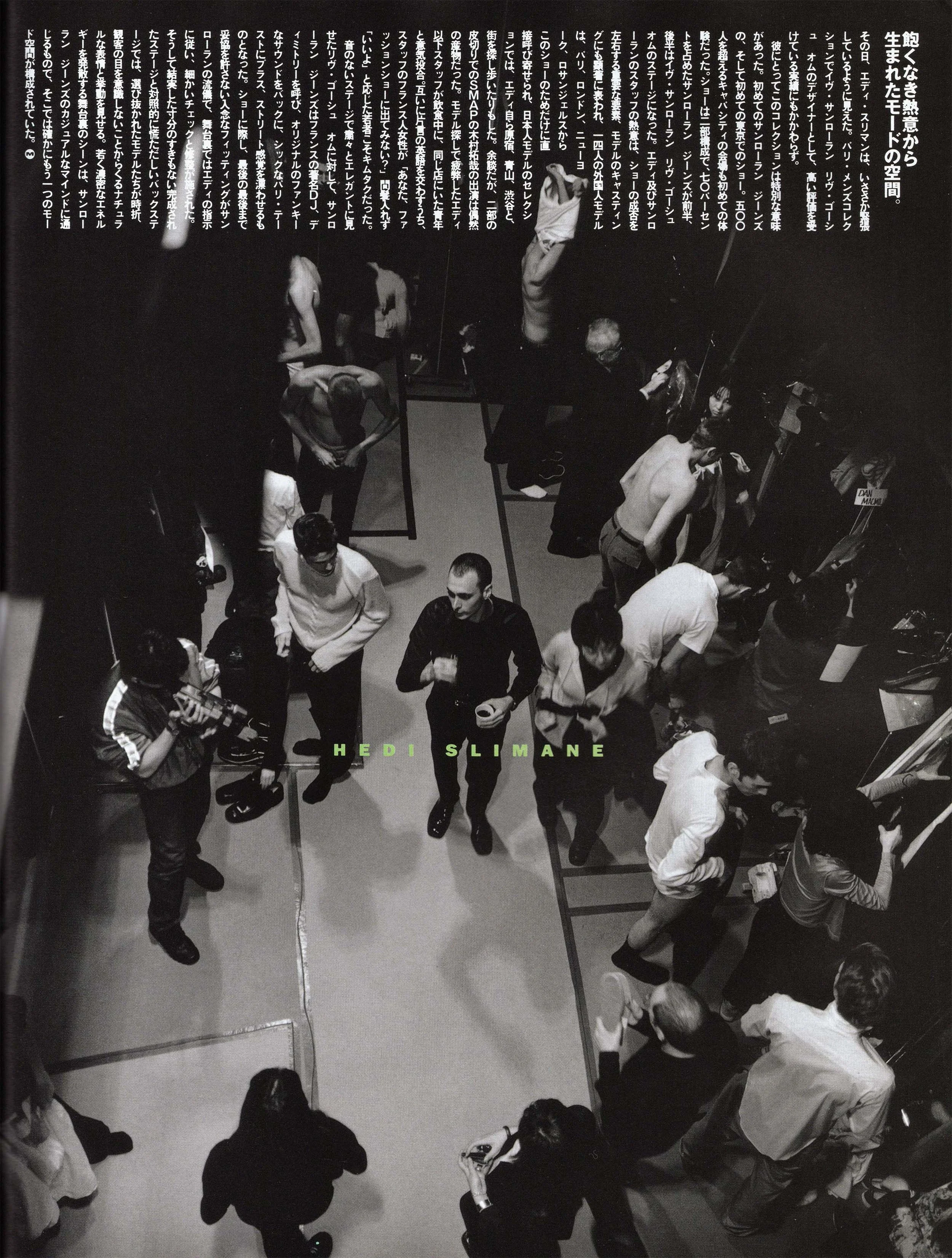 会場となった東京・神宮前スタジオの舞台裏で、エディ・スリマンはモデルの一挙手一投足に絶え間なく注意を払い、適切な指示を加えていた。観客の反応を至近距離で受けるモデルたちは、ステージから戻るといちはやく成功を確信し、表情から緊張は消える。ショー終了後、エディらスタッフを交えた打上げは深夜まで続き、はしゃぎすぎて翌日の飛行機に乗り遅れたモデルまでいたらしい。初来日も多かった彼らにとっても、東京でのショ一は特別の感慨があったのだろう。